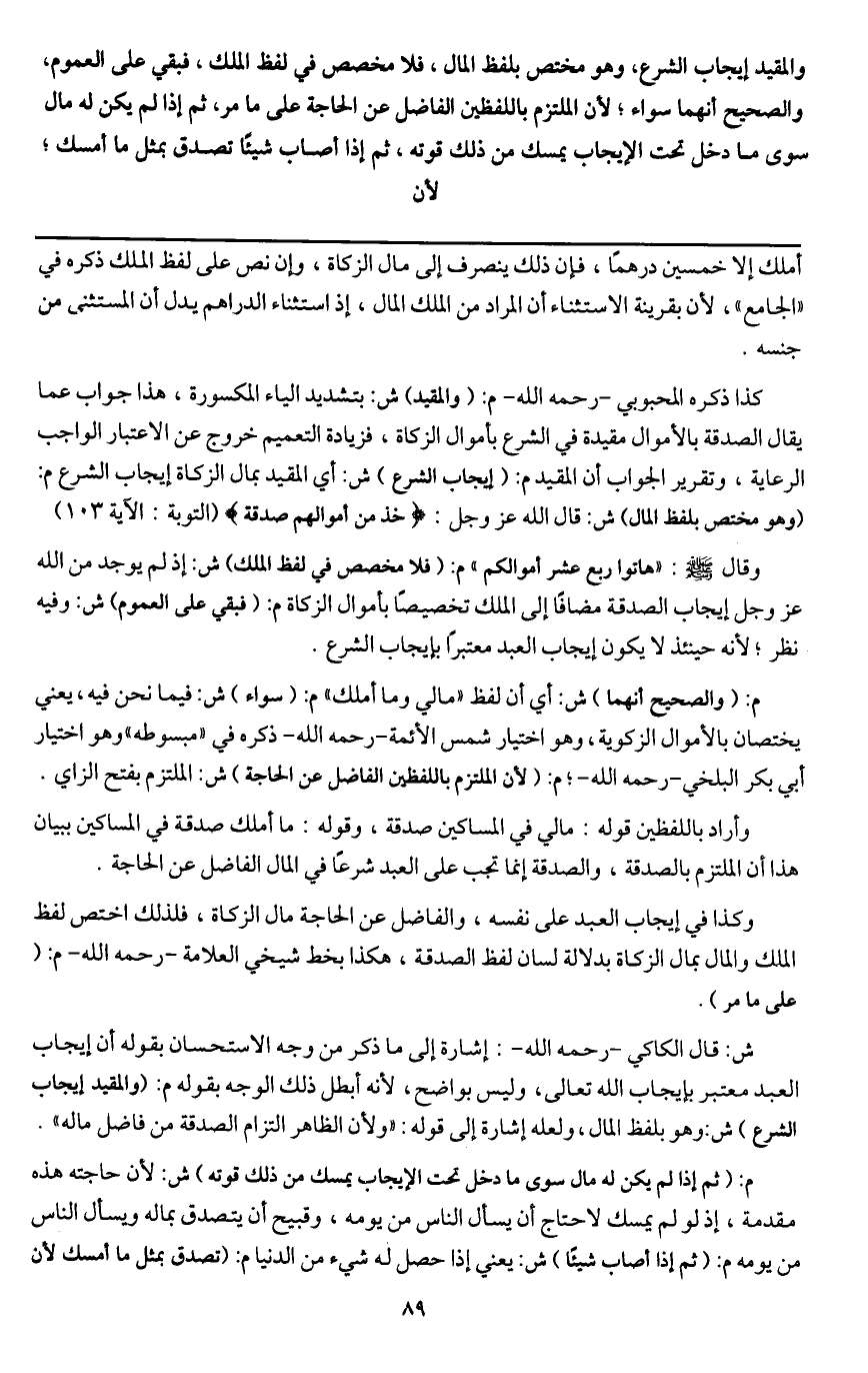 وكذا في إيجاب العبد على نفسه، والفاضل عن الحاجة مال الزكاة، فلذلك اختص لفظ الملك والمال بمال الزكاة بدلالة لسان لفظ الصدقة، هكذا بخط شيخي العلامة - رَحِمَهُ اللَّهُ - م: (على ما مر) .