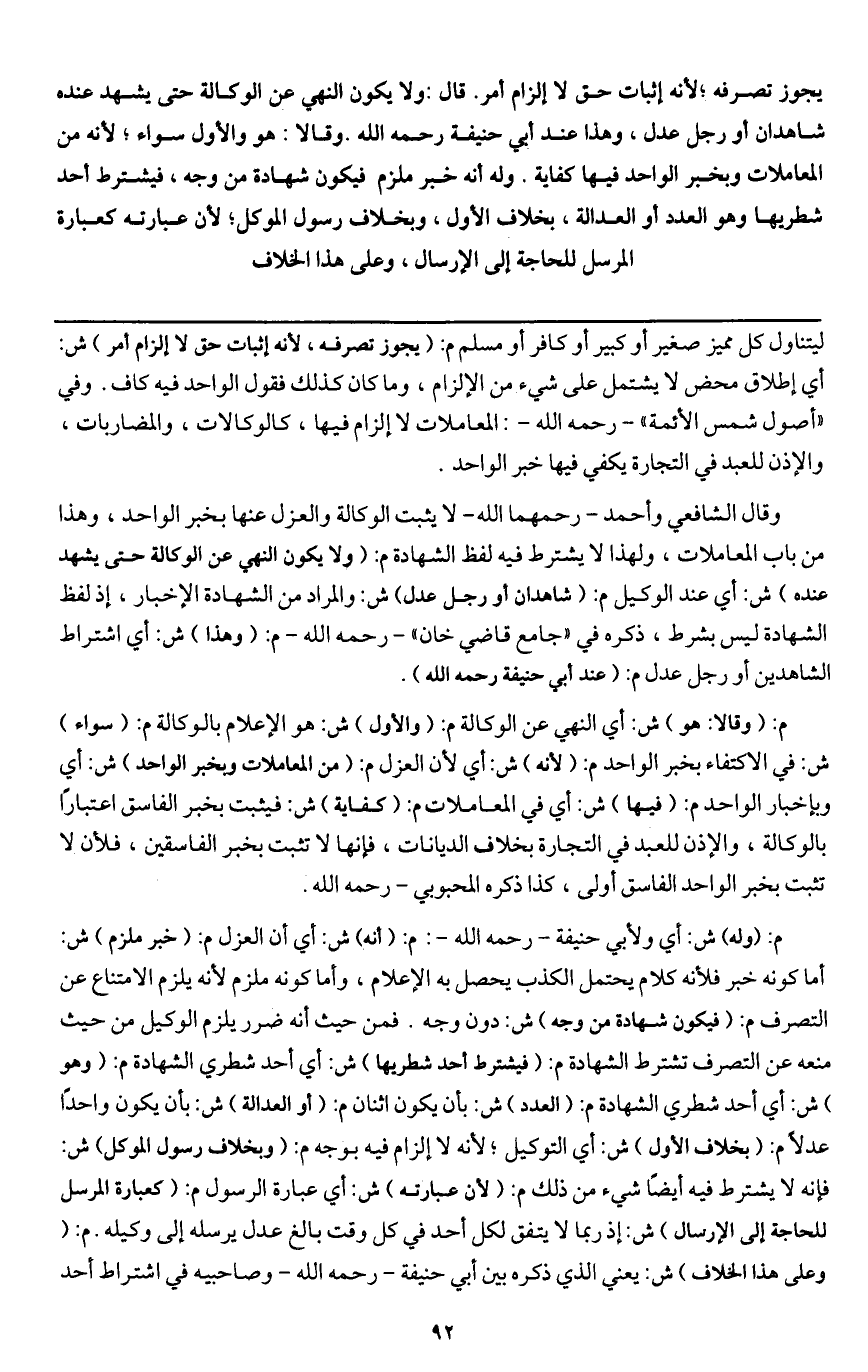 وقال الشافعي وأحمد - رحمهما الله - لا يثبت الوكالة والعزل عنها بخبر الواحد، وهذا من باب المعاملات، ولهذا لا يشترط فيه لفظ الشهادة م: (ولا يكون النهي عن الوكالة حتى يشهد عنده) ش: أي عند الوكيل م: (شاهدان أو رجل عدل) ش: والمراد من الشهادة الإخبار، إذ لفظ الشهادة ليس بشرط، ذكره في " جامع قاضي خان " - رَحِمَهُ اللَّهُ - م: (وهذا) ش: أي اشتراط الشاهدين أو رجل عدل م: (عند أبي حنيفة - رَحِمَهُ اللَّهُ -) .