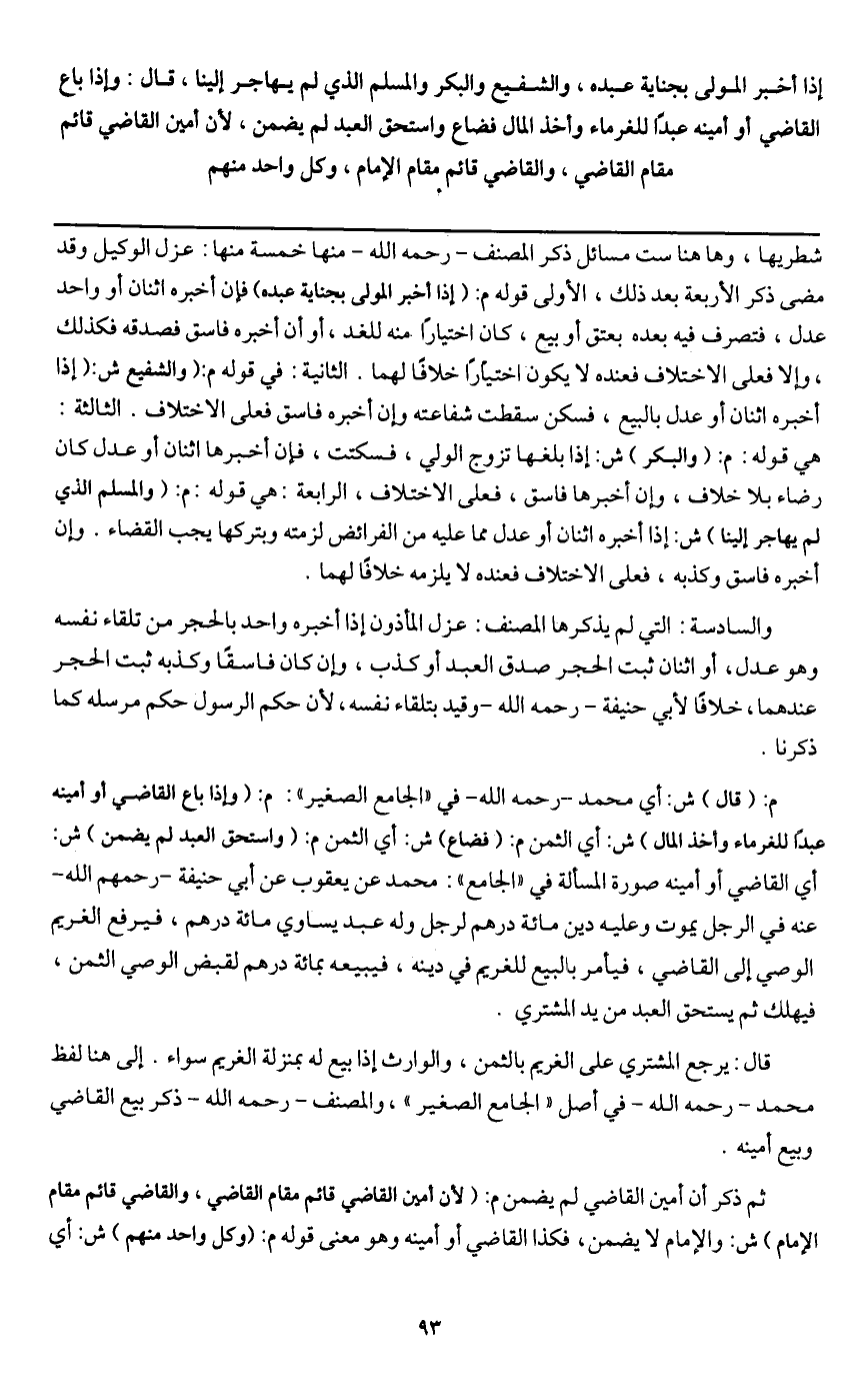 إذا أخبر المولى بجناية عبده، والشفيع والبكر والمسلم الذي لم يهاجر إلينا، قال: وإذا باع القاضي أو أمينه عبدا للغرماء وأخذ المال فضاع واستحق العبد لم يضمن؛ لأن أمين القاضي قائم مقام القاضي، والقاضي قائم مقام الإمام، وكل واحد منهم