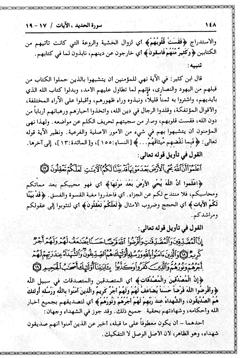 إِنَّ الْمُصَّدِّقِينَ وَالْمُصَّدِّقاتِ وَأَقْرَضُوا اللَّهَ قَرْضاً حَسَناً يُضاعَفُ لَهُمْ وَلَهُمْ أَجْرٌ كَرِيمٌ (18) وَالَّذِينَ آمَنُوا بِاللَّهِ وَرُسُلِهِ أُولئِكَ هُمُ الصِّدِّيقُونَ وَالشُّهَداءُ عِنْدَ رَبِّهِمْ لَهُمْ أَجْرُهُمْ وَنُورُهُمْ وَالَّذِينَ كَفَرُوا وَكَذَّبُوا بِآياتِنا أُولئِكَ أَصْحابُ الْجَحِيمِ (19)