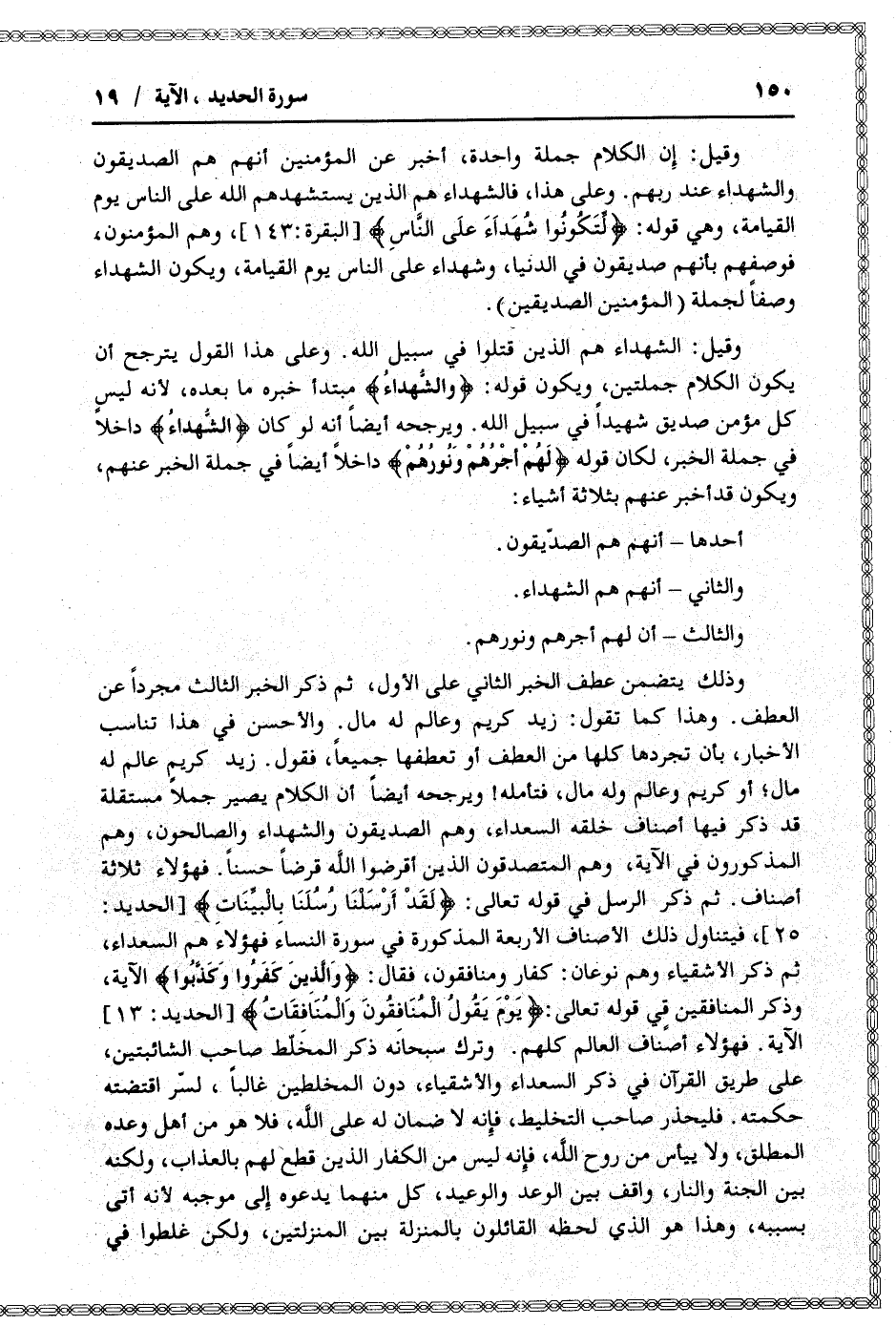 وذلك يتضمن عطف الخبر الثاني على الأول، ثم ذكر الخبر الثالث مجردا عن العطف. وهذا كما تقول: زيد كريم وعالم له مال. والأحسن في هذا تناسب الأخبار، بأن تجردها كلها من العطف أو تعطفها جميعا، فقول. زيد كريم عالم له مال أو كريم وعالم وله مال، فتأمله! ويرجحه أيضا أن الكلام يصير جملا مستقلة قد ذكر فيها أصناف خلقه السعداء، وهم الصديقون والشهداء والصالحون، وهم المذكورون في الآية، وهم المتصدقون الذين أقرضوا الله قرضا حسنا. فهؤلاء ثلاثة أصناف. ثم ذكر الرسل في قوله تعالى: لَقَدْ أَرْسَلْنا رُسُلَنا بِالْبَيِّناتِ [الحديد: