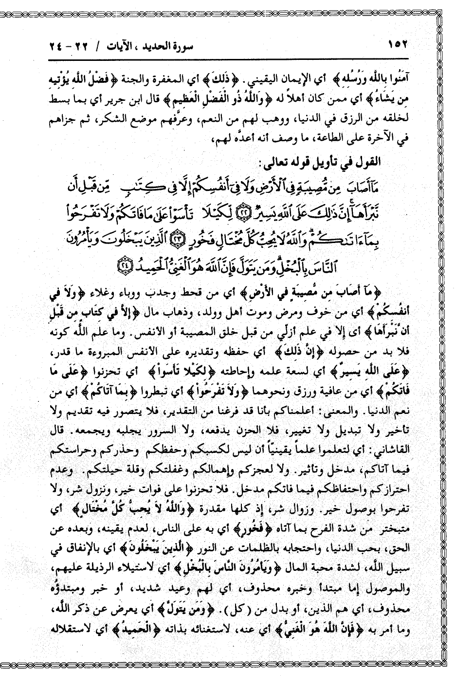 ما أَصابَ مِنْ مُصِيبَةٍ فِي الْأَرْضِ وَلا فِي أَنْفُسِكُمْ إِلاَّ فِي كِتابٍ مِنْ قَبْلِ أَنْ نَبْرَأَها إِنَّ ذلِكَ عَلَى اللَّهِ يَسِيرٌ (22) لِكَيْلا تَأْسَوْا عَلى ما فاتَكُمْ وَلا تَفْرَحُوا بِما آتاكُمْ وَاللَّهُ لا يُحِبُّ كُلَّ مُخْتالٍ فَخُورٍ (23) الَّذِينَ يَبْخَلُونَ وَيَأْمُرُونَ النَّاسَ بِالْبُخْلِ وَمَنْ يَتَوَلَّ فَإِنَّ اللَّهَ هُوَ الْغَنِيُّ الْحَمِيدُ (24)