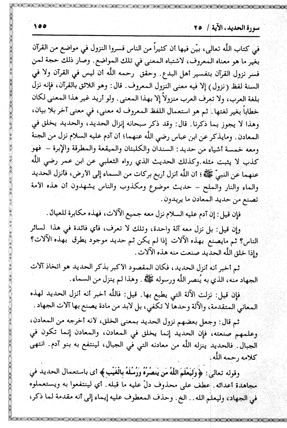 فإن قيل: نزلت الآلة التي يطبع بها. قيل: فالله أخبر أنه أنزل الحديد لهذه المعاني المتقدمة، والآلة وحدها لا تكفي، بل لا بد من مادة يصنع بها آلات الجهاد.
