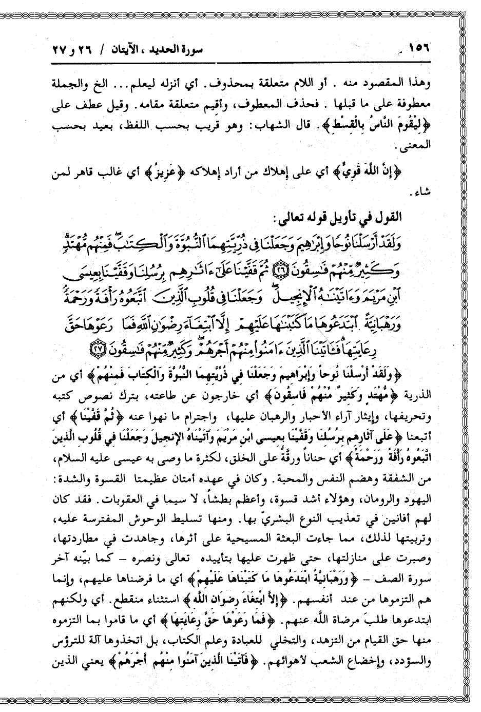 وَلَقَدْ أَرْسَلْنا نُوحاً وَإِبْراهِيمَ وَجَعَلْنا فِي ذُرِّيَّتِهِمَا النُّبُوَّةَ وَالْكِتابَ فَمِنْهُمْ مُهْتَدٍ وَكَثِيرٌ مِنْهُمْ فاسِقُونَ (26) ثُمَّ قَفَّيْنا عَلى آثارِهِمْ بِرُسُلِنا وَقَفَّيْنا بِعِيسَى ابْنِ مَرْيَمَ وَآتَيْناهُ الْإِنْجِيلَ وَجَعَلْنا فِي قُلُوبِ الَّذِينَ اتَّبَعُوهُ رَأْفَةً وَرَحْمَةً وَرَهْبانِيَّةً ابْتَدَعُوها ما كَتَبْناها عَلَيْهِمْ إِلاَّ ابْتِغاءَ رِضْوانِ اللَّهِ فَما رَعَوْها حَقَّ رِعايَتِها فَآتَيْنَا الَّذِينَ آمَنُوا مِنْهُمْ أَجْرَهُمْ وَكَثِيرٌ مِنْهُمْ فاسِقُونَ (27)