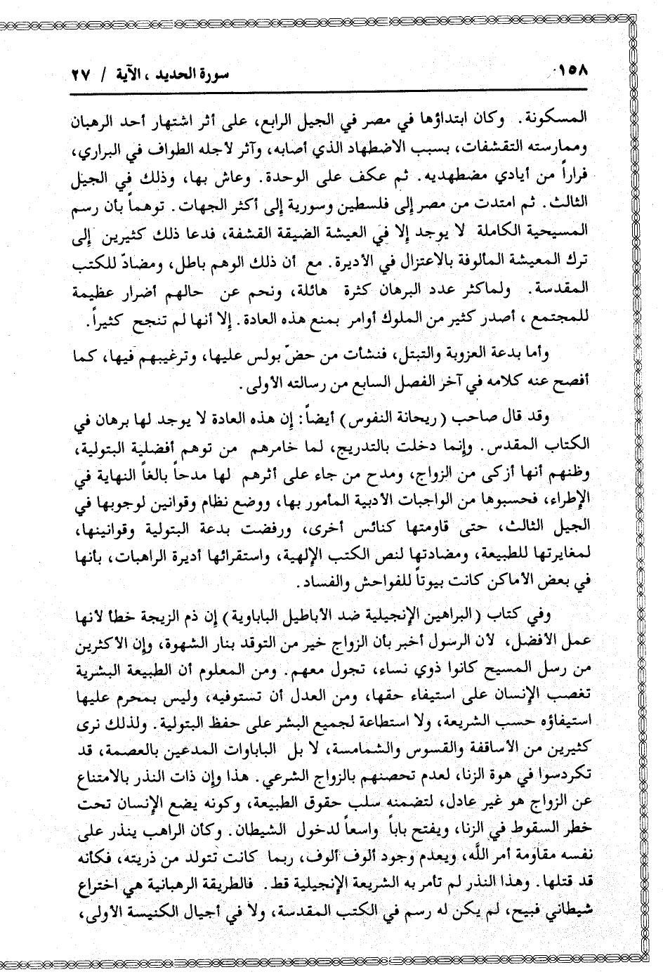 وقد قال صاحب (ريحانة النفوس) أيضا: إن هذه العادة لا يوجد لها برهان في الكتاب المقدس. وإنما دخلت بالتدريج، لما خامرهم من توهم أفضلية البتولية، وظنهم أنها أزكى من الزواج، ومدح من جاء على أثرهم لها مدحا بالغا النهاية في الإطراء، فحسبوها من الواجبات الأدبية المأمور بها، ووضع نظام وقوانين لوجوبها في الجيل الثالث، حتى قاومتها كنائس أخرى، ورفضت بدعة البتولية وقوانينها، لمغايرتها للطبيعة، ومضادتها لنص الكتب الإلهية، واستقرائها أديرة الراهبات، بأنها في بعض الأماكن كانت بيوتا للفواحش والفساد.