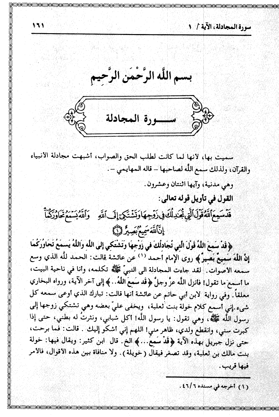 قَدْ سَمِعَ اللَّهُ قَوْلَ الَّتِي تُجادِلُكَ فِي زَوْجِها وَتَشْتَكِي إِلَى اللَّهِ وَاللَّهُ يَسْمَعُ تَحاوُرَكُما إِنَّ اللَّهَ سَمِيعٌ بَصِيرٌ (1)