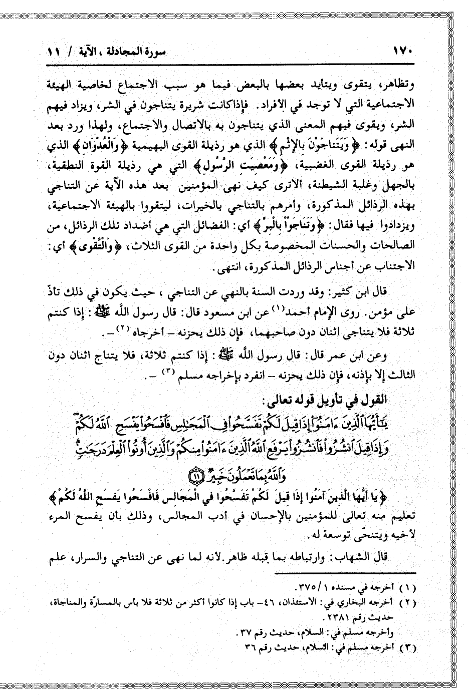 قال ابن كثير: وقد وردت السنة بالنهي عن التناجي، حيث يكون في ذلك تأذّ على مؤمن.
