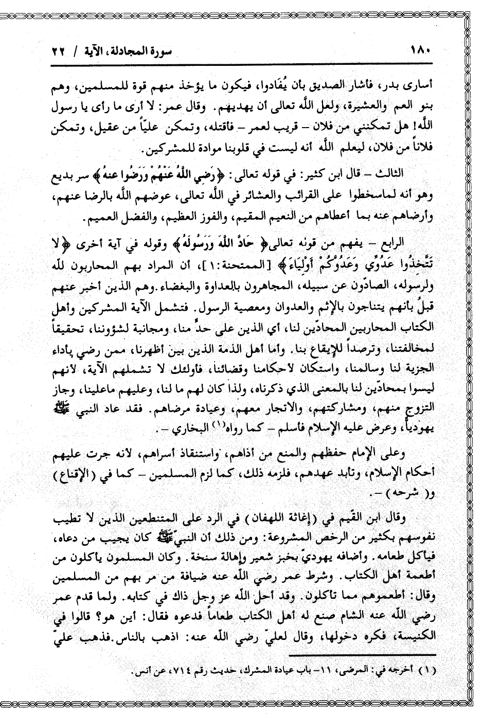 الرابع- يفهم من قوله تعالى حَادَّ اللَّهَ وَرَسُولَهُ وقوله في آية أخرى لا تَتَّخِذُوا عَدُوِّي وَعَدُوَّكُمْ أَوْلِياءَ [الممتحنة: 1] ، أن المراد بهم المحاربون لله ولرسوله، الصادّون عن سبيله، المجاهرون بالعداوة والبغضاء. وهم الذين أخبر عنهم قبل بأنهم يتناجون بالإثم والعدوان ومعصية الرسول. فتشمل الآية المشركين وأهل الكتاب المحاربين المحادّين لنا، أي الذين على حدّ منا، ومجانبة لشئوننا، تحقيقا لمخالفتنا، وترصدا للإيقاع بنا. وأما أهل الذمة الذين بين أظهرنا، ممن رضي بأداء الجزية لنا وسالمنا، واستكان لأحكامنا وقضائنا، فأولئك لا تشملهم الآية، لأنهم ليسوا بمحادّين لنا بالمعنى الذي ذكرناه، ولذا كان لهم ما لنا، وعليهم ما علينا، وجاز التزوج منهم، ومشاركتهم، والاتجار معهم، وعيادة مرضاهم. فقد عاد النبي صلى الله عليه وسلم يهوديّا، وعرض عليه الإسلام فأسلم- كما رواه «1» البخاري-.