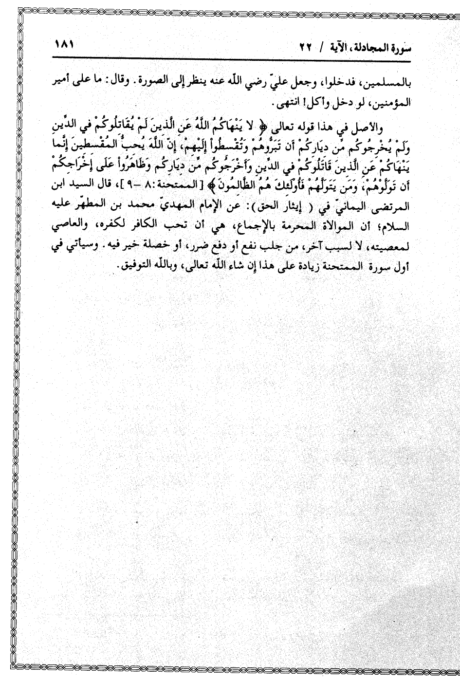 والأصل في هذا قوله تعالى لا يَنْهاكُمُ اللَّهُ عَنِ الَّذِينَ لَمْ يُقاتِلُوكُمْ فِي الدِّينِ وَلَمْ يُخْرِجُوكُمْ مِنْ دِيارِكُمْ أَنْ تَبَرُّوهُمْ وَتُقْسِطُوا إِلَيْهِمْ، إِنَّ اللَّهَ يُحِبُّ الْمُقْسِطِينَ إِنَّما يَنْهاكُمُ اللَّهُ عَنِ الَّذِينَ قاتَلُوكُمْ فِي الدِّينِ وَأَخْرَجُوكُمْ مِنْ دِيارِكُمْ وَظاهَرُوا عَلى إِخْراجِكُمْ أَنْ تَوَلَّوْهُمْ، وَمَنْ يَتَوَلَّهُمْ فَأُولئِكَ هُمُ الظَّالِمُونَ [الممتحنة: 8- 9] ، قال السيد ابن المرتضى اليمانيّ في (إيثار الحق) : عن الإمام المهديّ محمد بن المطهّر عليه السلام أن الموالاة المحرمة بالإجماع، هي أن تحب الكافر لكفره، والعاصي لمعصيته، لا لسبب آخر، من جلب نفع أو دفع ضرر، أو خصلة خير فيه. وسيأتي في أول سورة الممتحنة زيادة على هذا إن شاء الله تعالى، وبالله التوفيق.