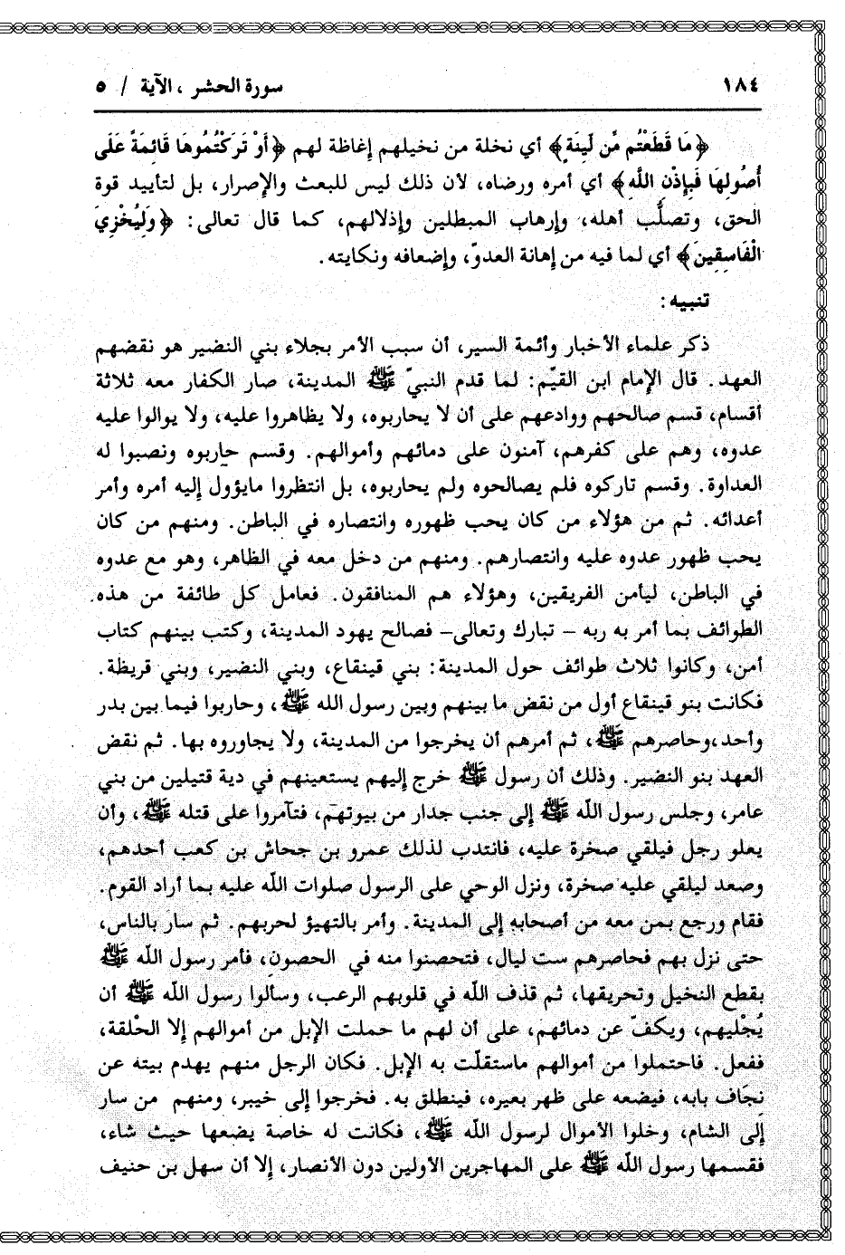ما قَطَعْتُمْ مِنْ لِينَةٍ أي نخلة من نخيلهم إغاظة لهم أَوْ تَرَكْتُمُوها قائِمَةً عَلى أُصُولِها فَبِإِذْنِ اللَّهِ أي أمره ورضاه، لأن ذلك ليس للبعث والإصرار، بل لتأييد قوة الحق، وتصلّب أهله، وإرهاب المبطلين وإذلالهم، كما قال تعالى: وَلِيُخْزِيَ الْفاسِقِينَ أي لما فيه من إهانة العدوّ، وإضعافه ونكايته.