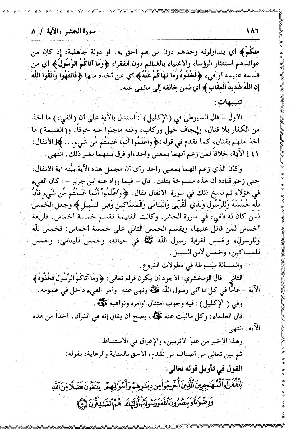الثاني- قال الزمخشري: الأجود أن يكون قوله تعالى: وَما آتاكُمُ الرَّسُولُ فَخُذُوهُ الآية- عامّا في كل ما آتى رسول الله صلى الله عليه وسلم ونهى عنه. وأمر الفيء داخل في عمومه.