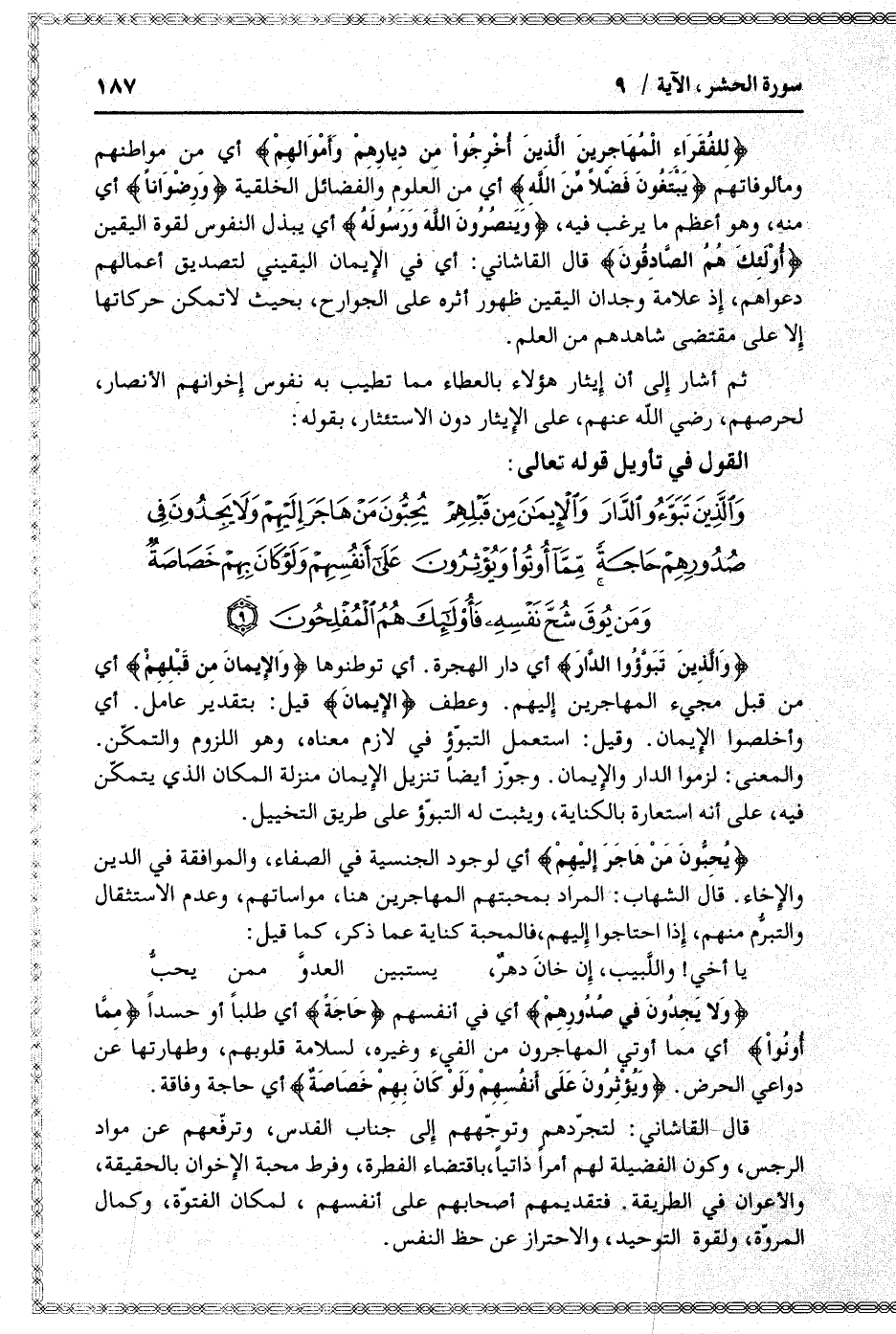 لِلْفُقَراءِ الْمُهاجِرِينَ الَّذِينَ أُخْرِجُوا مِنْ دِيارِهِمْ وَأَمْوالِهِمْ أي من مواطنهم ومألوفاتهم يَبْتَغُونَ فَضْلًا مِنَ اللَّهِ أي من العلوم والفضائل الخلقية وَرِضْواناً أي منه، وهو أعظم ما يرغب فيه، وَيَنْصُرُونَ اللَّهَ وَرَسُولَهُ أي يبذل النفوس لقوة اليقين أُولئِكَ هُمُ الصَّادِقُونَ قال القاشاني: أي في الإيمان اليقيني لتصديق أعمالهم دعواهم، إذ علامة وجدان اليقين ظهور أثره على الجوارح، بحيث لا تمكن حركاتها إلا على مقتضى شاهدهم من العلم.
