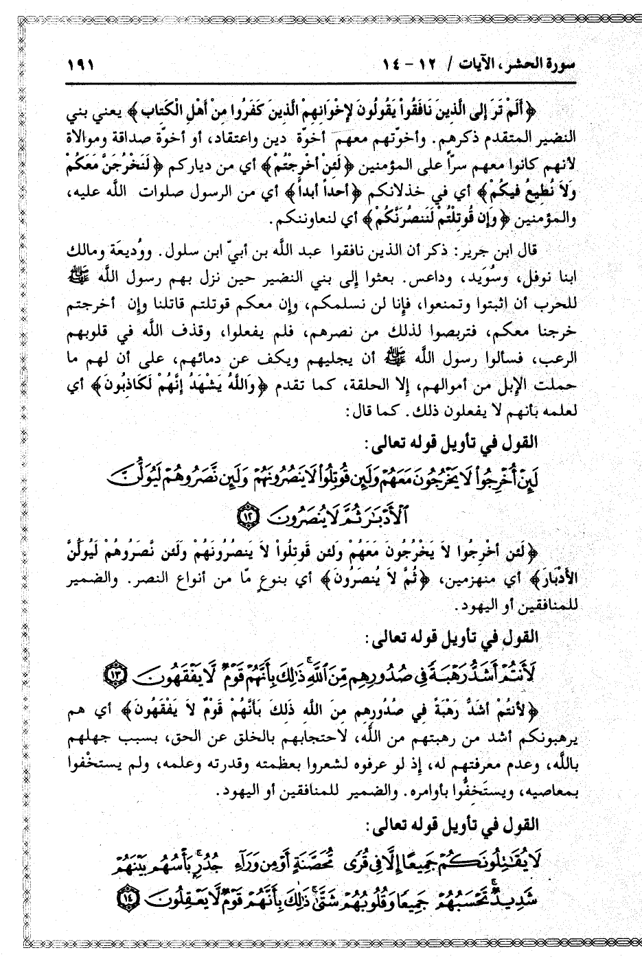 لَئِنْ أُخْرِجُوا لا يَخْرُجُونَ مَعَهُمْ وَلَئِنْ قُوتِلُوا لا يَنْصُرُونَهُمْ وَلَئِنْ نَصَرُوهُمْ لَيُوَلُّنَّ الْأَدْبارَ ثُمَّ لا يُنْصَرُونَ (12)