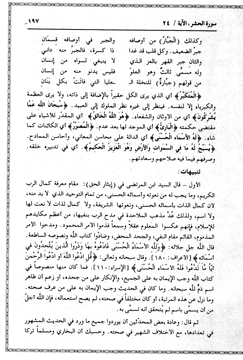 الْمُتَكَبِّرُ أي الذي يرى الكل حقيرا بالإضافة إلى ذاته، ولا يرى العظمة والكبرياء إلا لنفسه. فينظر إلى غيره نظر الملوك إلى العبيد. سُبْحانَ اللَّهِ عَمَّا يُشْرِكُونَ أي من الأوثان والشفعاء. هُوَ اللَّهُ الْخالِقُ أي المقدّر للأشياء على مقتضى حكمته الْبارِئُ أي الموجد لها بعد عدم. الْمُصَوِّرُ أي الكائنات كما شاء. لَهُ الْأَسْماءُ الْحُسْنى أي الدالة على محاسن المعاني، وأحاسن الممادح.