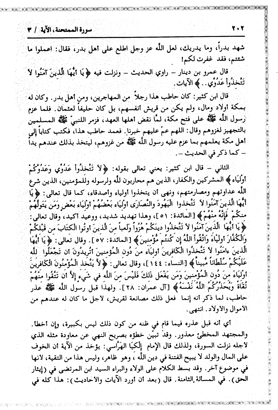 يا أَيُّهَا الَّذِينَ آمَنُوا لا تَتَّخِذُوا الَّذِينَ اتَّخَذُوا دِينَكُمْ هُزُواً وَلَعِباً مِنَ الَّذِينَ أُوتُوا الْكِتابَ مِنْ قَبْلِكُمْ وَالْكُفَّارَ أَوْلِياءَ وَاتَّقُوا اللَّهَ إِنْ كُنْتُمْ مُؤْمِنِينَ [المائدة: 57] . وقال تعالى: يا أَيُّهَا الَّذِينَ آمَنُوا لا تَتَّخِذُوا الْكافِرِينَ أَوْلِياءَ مِنْ دُونِ الْمُؤْمِنِينَ أَتُرِيدُونَ أَنْ تَجْعَلُوا لِلَّهِ عَلَيْكُمْ سُلْطاناً مُبِيناً [النساء: 144] ، وقال تعالى: لا يَتَّخِذِ الْمُؤْمِنُونَ الْكافِرِينَ أَوْلِياءَ مِنْ دُونِ الْمُؤْمِنِينَ وَمَنْ يَفْعَلْ ذلِكَ فَلَيْسَ مِنَ اللَّهِ فِي شَيْءٍ إِلَّا أَنْ تَتَّقُوا مِنْهُمْ تُقاةً وَيُحَذِّرُكُمُ اللَّهُ نَفْسَهُ [آل عمران: 28] . ولهذا قبل رسول الله صلى الله عليه وسلم عذر حاطب، لما ذكر أنه إنما فعل ذلك مصانعة لقريش، لأجل ما كان له عندهم من الأموال والأولاد. انتهى.