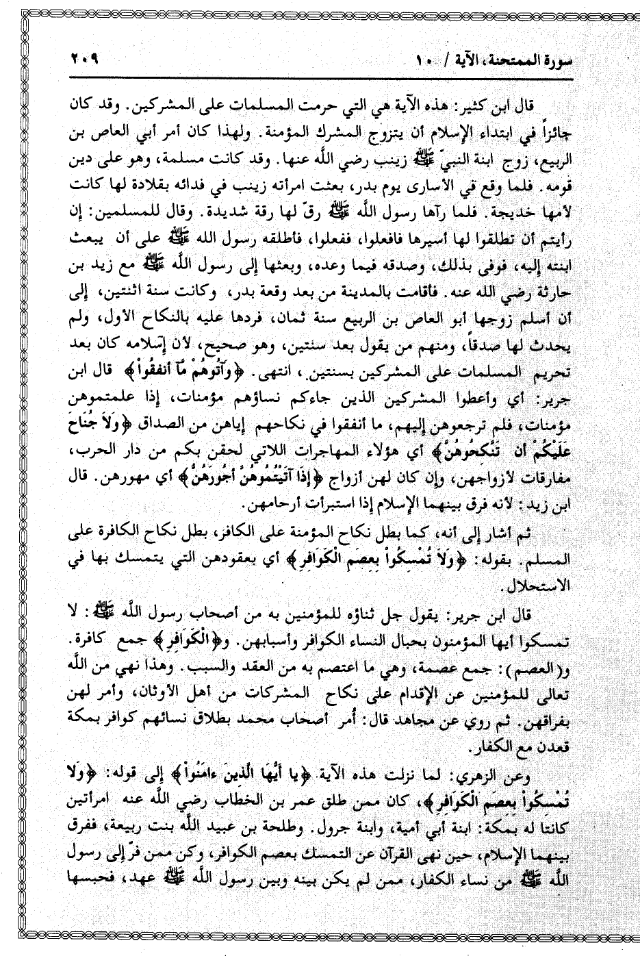 قال ابن كثير: هذه الآية هي التي حرمت المسلمات على المشركين. وقد كان جائزا في ابتداء الإسلام أن يتزوج المشرك المؤمنة. ولهذا كان أمر أبي العاص بن الربيع، زوج ابنة النبيّ صلى الله عليه وسلم زينب رضي الله عنها. وقد كانت مسلمة، وهو على دين قومه. فلما وقع في الأسارى يوم بدر، بعثت امرأته زينب في فدائه بقلادة لها كانت لأمها خديجة. فلما رآها رسول الله صلى الله عليه وسلم رقّ لها رقة شديدة. وقال للمسلمين: إن رأيتم أن تطلقوا لها أسيرها فافعلوا، ففعلوا