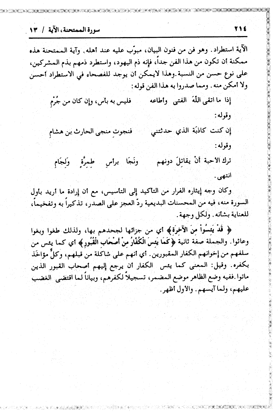 الآية استطراد. وهو فن من فنون البيان، مبوّب عليه عند أهله. وآية الممتحنة هذه ممكنة أن تكون من هذا الفن جدا، فإنه ذم اليهود، واستطرد ذمهم بذم المشركين، على نوع حسن من النسبة. وهذا لا يمكن أن يوجد للفصحاء في الاستطراد أحسن ولا أمكن منه. ومما صدروا به هذا الفن قوله: