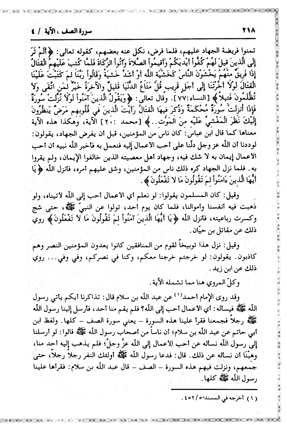 ولفظ ابن أبي حاتم عن عبد الله بن سلام أن ناسا من أصحاب رسول الله صلى الله عليه وسلم قالوا: لو أرسلنا إلى رسول الله نسأله عن أحب الأعمال إلى الله عزّ وجلّ فلم يذهب إليه أحد منا، وهبنا أن نسأله عن ذلك. قال: فدعا رسول الله صلى الله عليه وسلم أولئك النفر رجلا رجلا، حتى جمعهم، ونزلت فيهم هذه السورة- الصف- قال عبد الله بن سلام: فقرأها علينا رسول الله صلى الله عليه وسلم كلها.