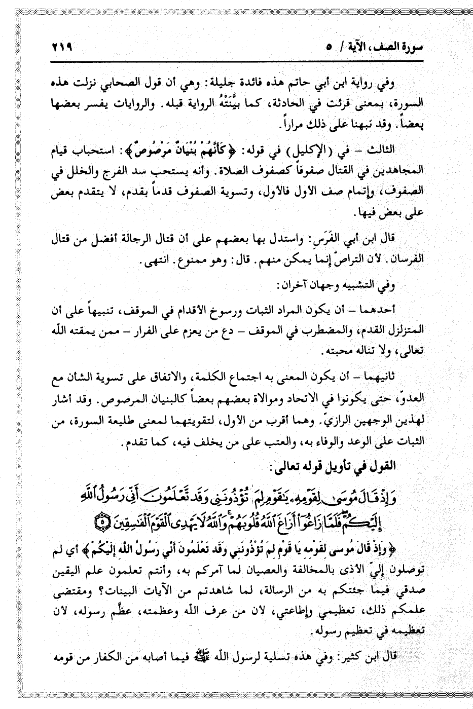 الثالث- في (الإكليل) في قوله: كَأَنَّهُمْ بُنْيانٌ مَرْصُوصٌ: استحباب قيام المجاهدين في القتال صفوفا كصفوف الصلاة. وأنه يستحب سد الفرج والخلل في الصفوف، وإتمام صف الأول فالأول، وتسوية الصفوف قدما بقدم، لا يتقدم بعض على بعض فيها.