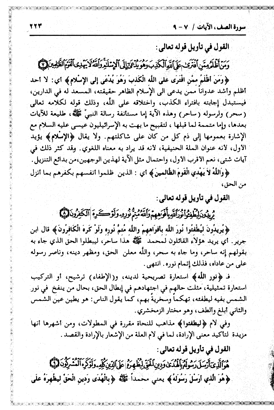 يُرِيدُونَ لِيُطْفِؤُا نُورَ اللَّهِ بِأَفْواهِهِمْ وَاللَّهُ مُتِمُّ نُورِهِ وَلَوْ كَرِهَ الْكافِرُونَ قال ابن جرير. أي يريد هؤلاء القائلون لمحمد صلى الله عليه وسلم هذا ساحر، ليبطلوا الحق الذي جاء به بقولهم إنه ساحر، وما جاء به سحر، والله معلن الحق، ومظهر دينه، وناصر رسوله على من عاداه، فذلك إتمام نوره. انتهى.