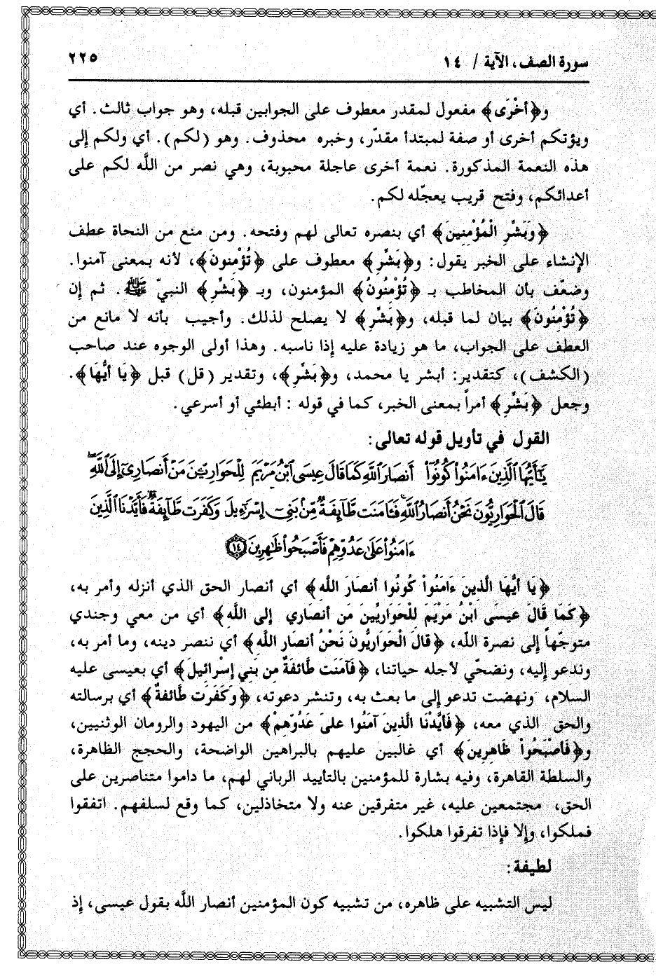 يا أَيُّهَا الَّذِينَ آمَنُوا كُونُوا أَنْصارَ اللَّهِ كَما قالَ عِيسَى ابْنُ مَرْيَمَ لِلْحَوارِيِّينَ مَنْ أَنْصارِي إِلَى اللَّهِ قالَ الْحَوارِيُّونَ نَحْنُ أَنْصارُ اللَّهِ فَآمَنَتْ طائِفَةٌ مِنْ بَنِي إِسْرائِيلَ وَكَفَرَتْ طائِفَةٌ فَأَيَّدْنَا الَّذِينَ آمَنُوا عَلى عَدُوِّهِمْ فَأَصْبَحُوا ظاهِرِينَ (14)