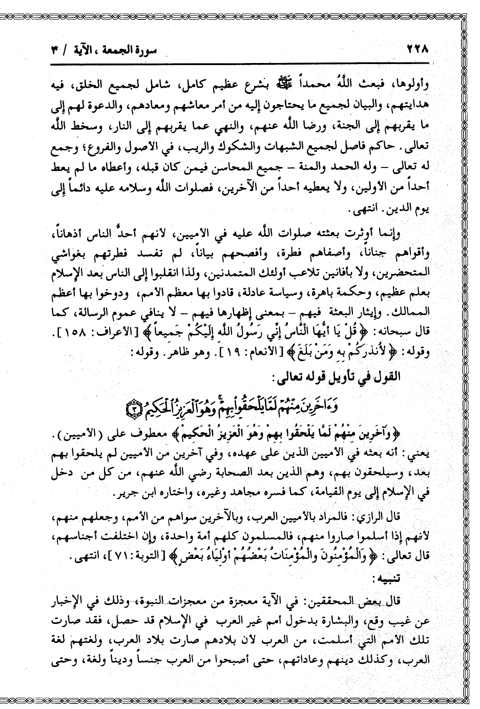 قال الرازي: فالمراد بالأميين العرب، وبالآخرين سواهم من الأمم، وجعلهم منهم، لأنهم إذا أسلموا صاروا منهم، فالمسلمون كلهم أمة واحدة، وإن اختلفت أجناسهم، قال تعالى: وَالْمُؤْمِنُونَ وَالْمُؤْمِناتُ بَعْضُهُمْ أَوْلِياءُ بَعْضٍ [التوبة: 71] ، انتهى.