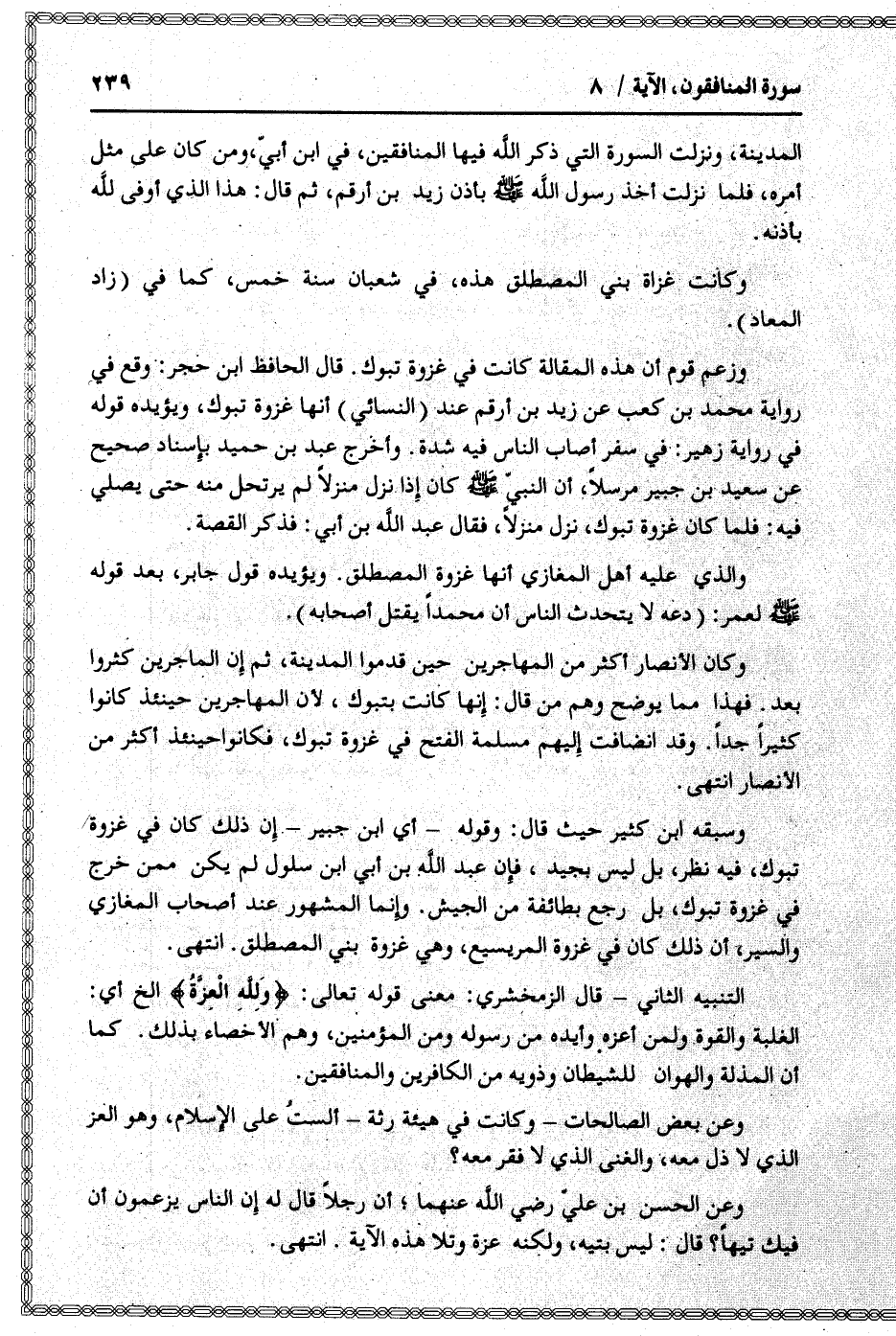 وسبقه ابن كثير حيث قال: وقوله- أي ابن جبير- إن ذلك كان في غزوة تبوك، فيه نظر، بل ليس بجيد، فإن عبد الله بن أبي ابن سلول لم يكن ممن خرج في غزوة تبوك، بل رجع بطائفة من الجيش. وإنما المشهور عند أصحاب المغازي والسير، أن ذلك كان في غزوة المريسيع، وهي غزوة بني المصطلق. انتهى.