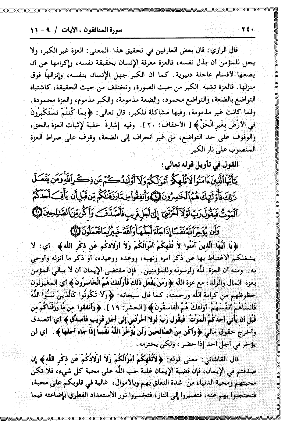 يا أَيُّهَا الَّذِينَ آمَنُوا لا تُلْهِكُمْ أَمْوالُكُمْ وَلا أَوْلادُكُمْ عَنْ ذِكْرِ اللَّهِ وَمَنْ يَفْعَلْ ذلِكَ فَأُولئِكَ هُمُ الْخاسِرُونَ (9) وَأَنْفِقُوا مِنْ ما رَزَقْناكُمْ مِنْ قَبْلِ أَنْ يَأْتِيَ أَحَدَكُمُ الْمَوْتُ فَيَقُولَ رَبِّ لَوْلا أَخَّرْتَنِي إِلى أَجَلٍ قَرِيبٍ فَأَصَّدَّقَ وَأَكُنْ مِنَ الصَّالِحِينَ (10) وَلَنْ يُؤَخِّرَ اللَّهُ نَفْساً إِذا جاءَ أَجَلُها وَاللَّهُ خَبِيرٌ بِما تَعْمَلُونَ (11)