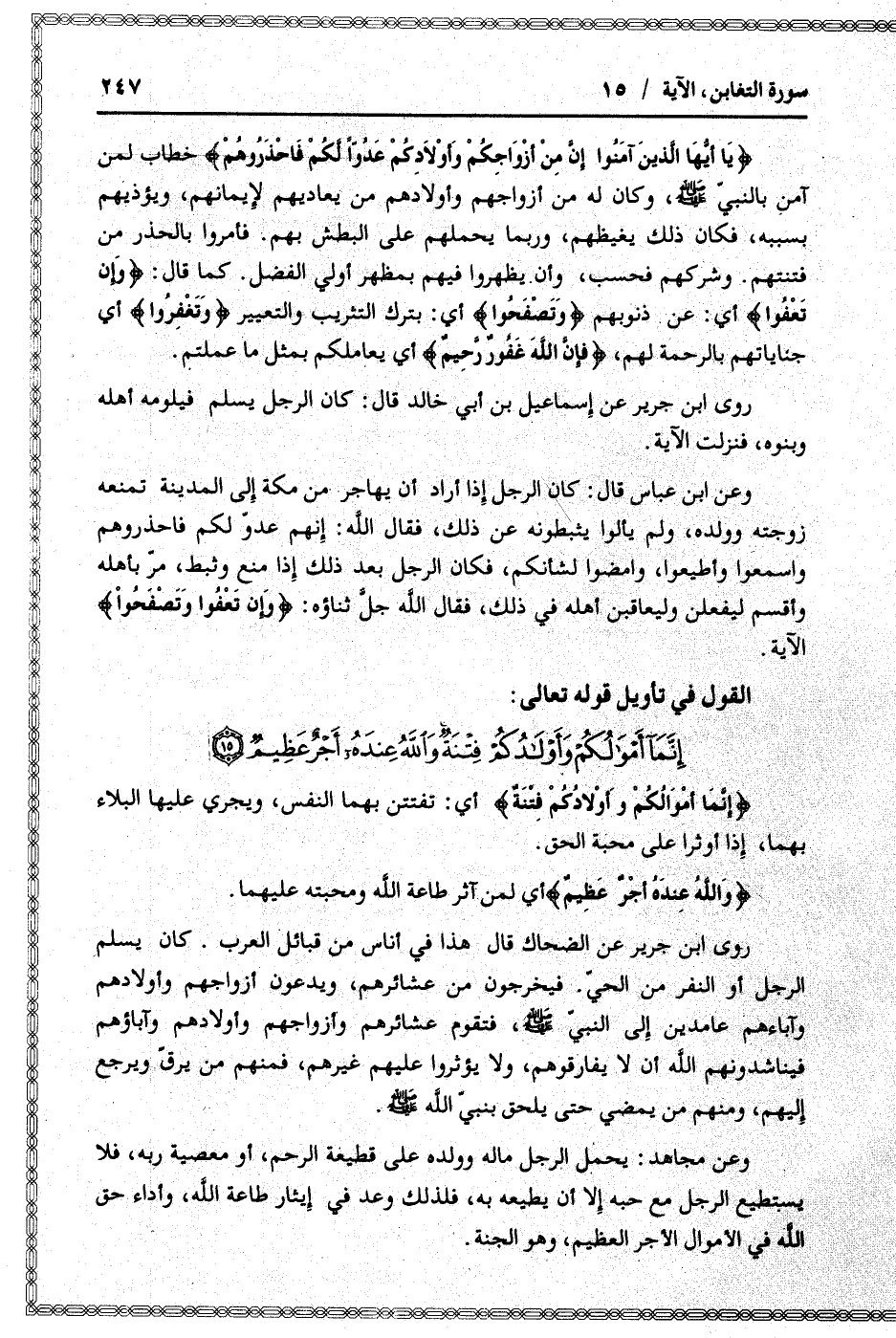 إِنَّما أَمْوالُكُمْ وَأَوْلادُكُمْ فِتْنَةٌ وَاللَّهُ عِنْدَهُ أَجْرٌ عَظِيمٌ (15)