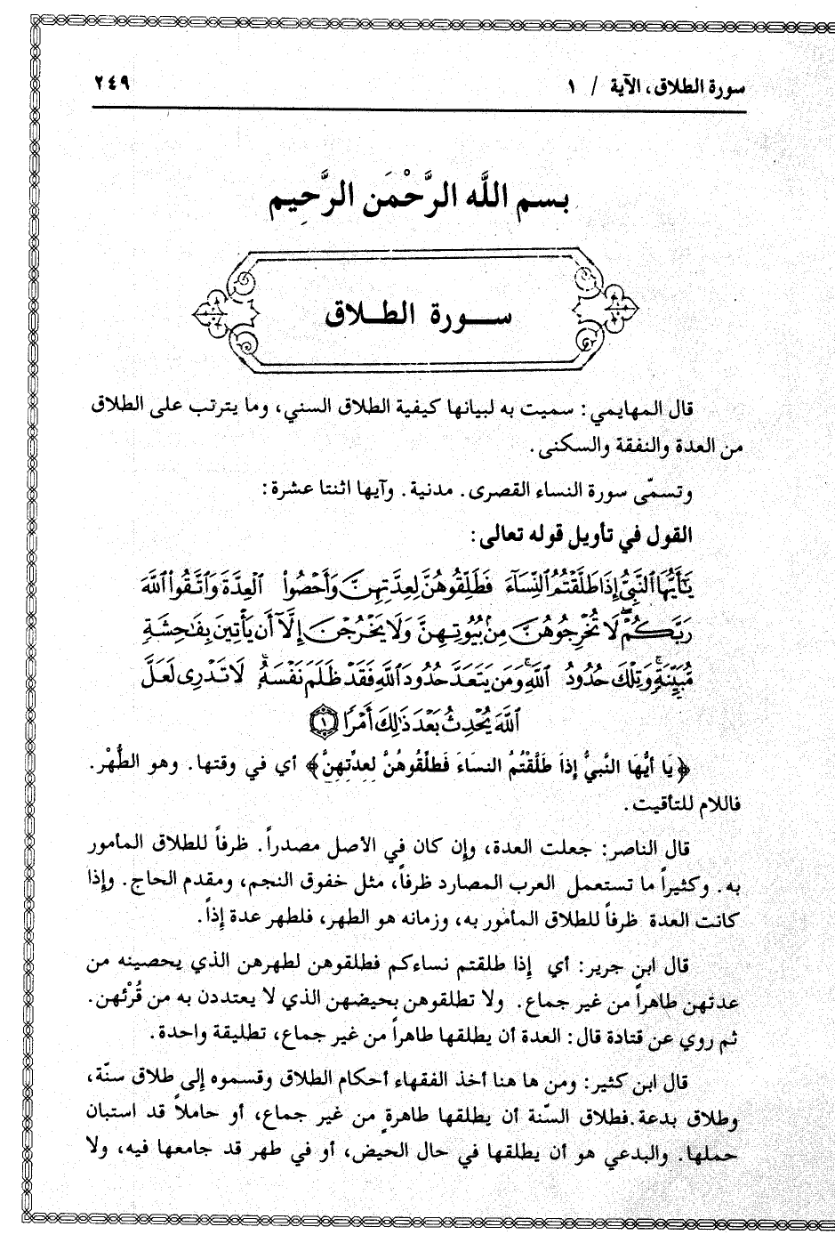 يا أَيُّهَا النَّبِيُّ إِذا طَلَّقْتُمُ النِّساءَ فَطَلِّقُوهُنَّ لِعِدَّتِهِنَّ وَأَحْصُوا الْعِدَّةَ وَاتَّقُوا اللَّهَ رَبَّكُمْ لا تُخْرِجُوهُنَّ مِنْ بُيُوتِهِنَّ وَلا يَخْرُجْنَ إِلاَّ أَنْ يَأْتِينَ بِفاحِشَةٍ مُبَيِّنَةٍ وَتِلْكَ حُدُودُ اللَّهِ وَمَنْ يَتَعَدَّ حُدُودَ اللَّهِ فَقَدْ ظَلَمَ نَفْسَهُ لا تَدْرِي لَعَلَّ اللَّهَ يُحْدِثُ بَعْدَ ذلِكَ أَمْراً (1)