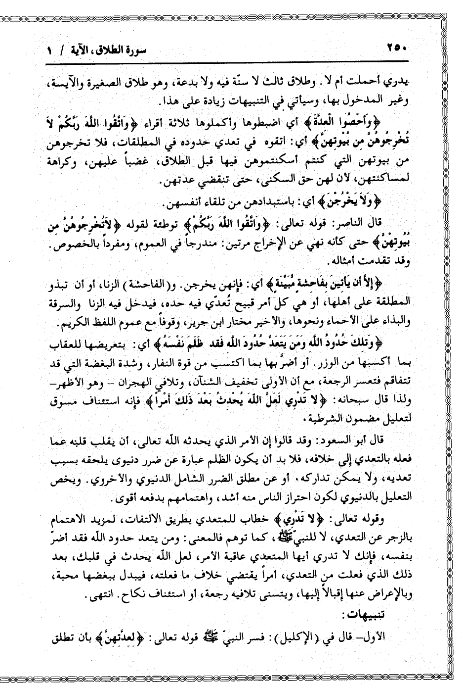 إِلَّا أَنْ يَأْتِينَ بِفاحِشَةٍ مُبَيِّنَةٍ أي: فإنهن يخرجن. و (الفاحشة) الزنا، أو أن تبذو المطلقة على أهلها، أو هي كل أمر قبيح تعدّي فيه حده، فيدخل فيه الزنا والسرقة والبذاء على الأحماء ونحوها، والأخير مختار ابن جرير، وقوفا مع عموم اللفظ الكريم.