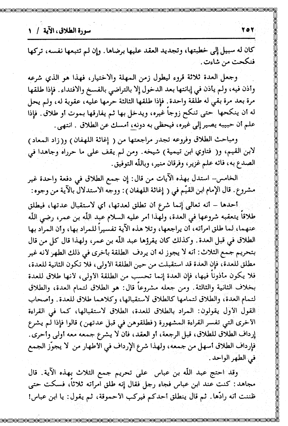 وقد احتج عبد الله بن عباس على تحريم جمع الثلاث بهذه الآية. قال مجاهد: كنت عند ابن عباس فجاء رجل فقال إنه طلق امرأته ثلاثا، فسكت حتى ظننت أنه رادّها. ثم قال ينطلق أحدكم فيركب الأحموقة، ثم يقول: يا ابن عباس!