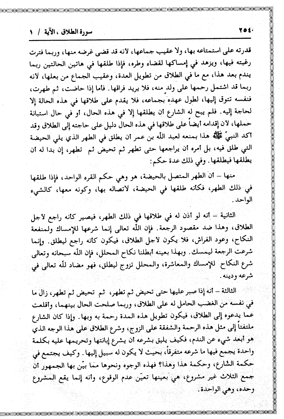 الثالثة- أنه إذا صبر عليها حتى تحيض ثم تطهر، ثم تحيض ثم تطهر، زال ما في نفسه من الغضب الحامل له على الطلاق، وربما صلحت الحال بينهما، وأقلعت عما يدعوه إلى الطلاق، فيكون تطويل هذه المدة رحمة به وبها. وإذا كان الشارع ملتفتا إلى مثل هذه الرحمة والشفقة على الزوج، وشرع الطلاق على هذا الوجه الذي هو أبعد شيء عن الندم، فكيف يليق بشرعه أن يشرع إبانتها وتحريمها عليه بكلمة واحدة يجمع فيها ما شرعه متفرقا، بحيث لا يكون له سبيل إليها. وكيف يجتمع في حكمة الشارع، وحكمة هذا وهذا؟ فهذه الوجوه ونحوها مما بيّن بها الجمهور أن جمع الثلاث غير مشروع، هي بعينها تعيّن عدم الوقوع، وأنه إنما يقع المشروع وحده، وهي الواحدة.