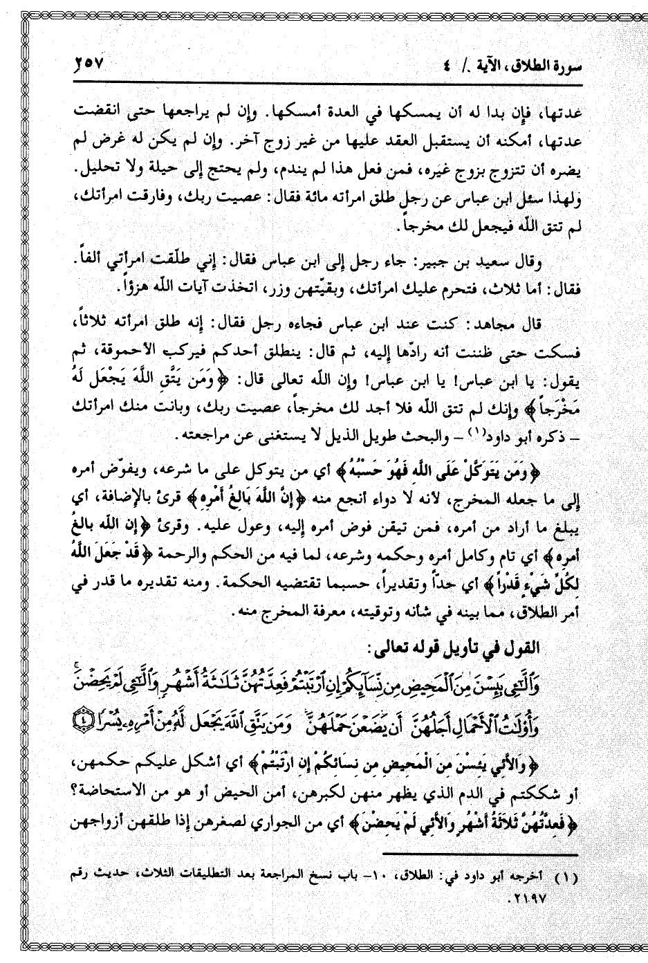 وَاللاَّئِي يَئِسْنَ مِنَ الْمَحِيضِ مِنْ نِسائِكُمْ إِنِ ارْتَبْتُمْ فَعِدَّتُهُنَّ ثَلاثَةُ أَشْهُرٍ وَاللاَّئِي لَمْ يَحِضْنَ وَأُولاتُ الْأَحْمالِ أَجَلُهُنَّ أَنْ يَضَعْنَ حَمْلَهُنَّ وَمَنْ يَتَّقِ اللَّهَ يَجْعَلْ لَهُ مِنْ أَمْرِهِ يُسْراً (4)