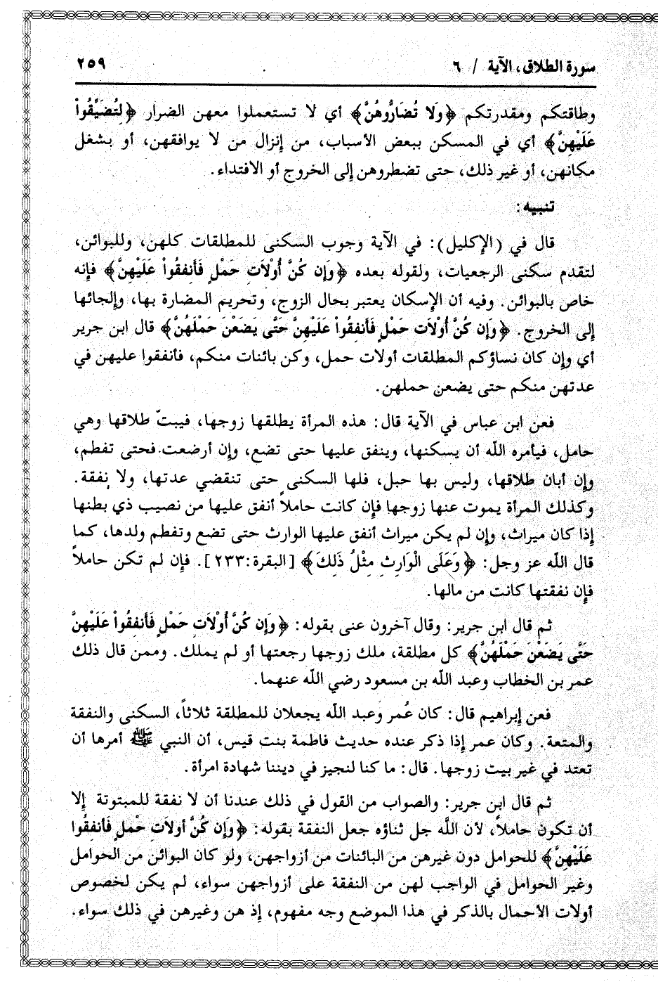 قال في (الإكليل) : في الآية وجوب السكنى للمطلقات كلهن، وللبوائن، لتقدم سكنى الرجعيات، ولقوله بعده وَإِنْ كُنَّ أُولاتِ حَمْلٍ فَأَنْفِقُوا عَلَيْهِنَّ فإنه خاص بالبوائن. وفيه أن الإسكان يعتبر بحال الزوج، وتحريم المضارة بها، وإلجائها إلى الخروج. وَإِنْ كُنَّ أُولاتِ حَمْلٍ فَأَنْفِقُوا عَلَيْهِنَّ حَتَّى يَضَعْنَ حَمْلَهُنَّ قال ابن جرير أي وإن كان نساؤكم المطلقات أولات حمل، وكن بائنات منكم، فأنفقوا عليهن في عدتهن منكم حتى يضعن حملهن.