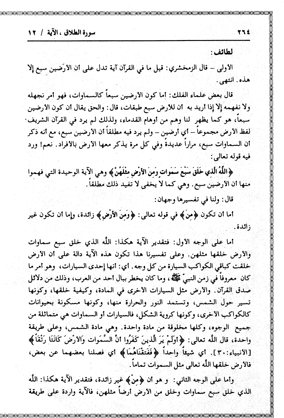 أما على الوجه الأول: فتقدير الآية هكذا: الله الذي خلق سبع سماوات والأرض خلقها مثلهن. وعلى تفسيرنا هذا تكون هذه الآية دالة على أن الأرض خلقت كباقي الكواكب السيارة من كل وجه. أي: أنها إحدى السيارات، وهو أمر ما كان معروفا في زمن النبيّ صلى الله عليه وسلم، وما كان يخطر ببال أحد من العرب، وذلك من دلائل صدق القرآن. والأرض مثل السيارات الأخرى في المادة، وكيفية خلقها، وكونها تسير حول الشمس، وتستمد النور والحرارة منها، وكونها مسكونة بحيوانات كالكواكب الأخرى، وكونها كروية الشكل، فالسيارات أو السماوات هي متماثلة من جميع الوجوه، وكلها مخلوقة من مادة واحدة. وهي مادة الشمس، وعلى طريقة واحدة، قال الله تعالى: أَوَلَمْ يَرَ الَّذِينَ كَفَرُوا أَنَّ السَّماواتِ وَالْأَرْضَ كانَتا رَتْقاً [الأنبياء: 30] . أي شيئا واحدا فَفَتَقْناهُما أي فصلنا بعضهما عن بعض، فالأرض خلقها الله تعالى مثل السموات تماما.