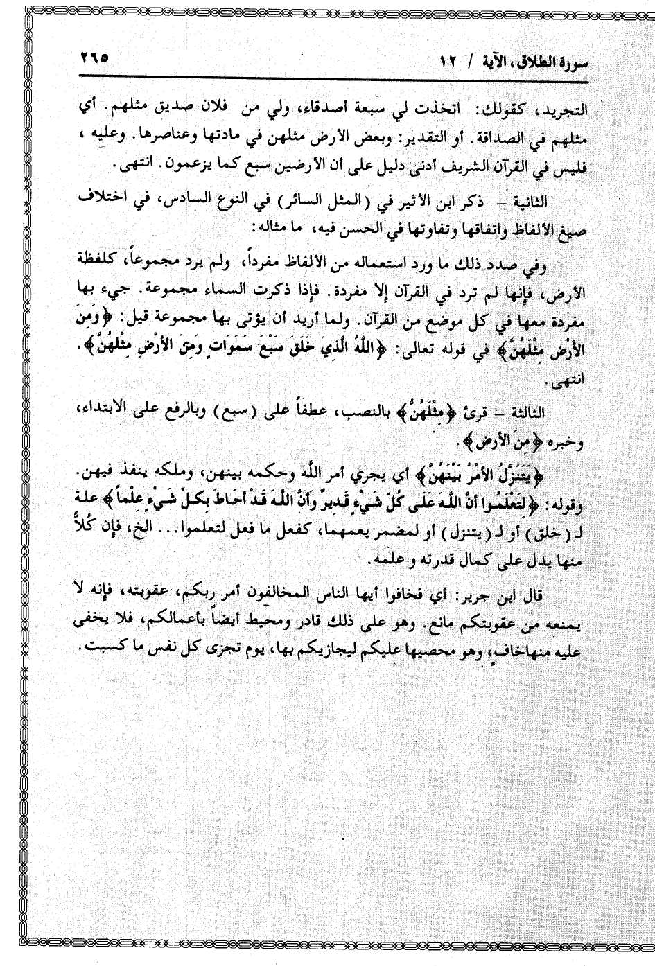التجريد، كقولك: اتخذت لي سبعة أصدقاء، ولي من فلان صديق مثلهم. أي مثلهم في الصداقة. أو التقدير: وبعض الأرض مثلهن في مادتها وعناصرها. وعليه، فليس في القرآن الشريف أدنى دليل على أن الأرضين سبع كما يزعمون. انتهى.
