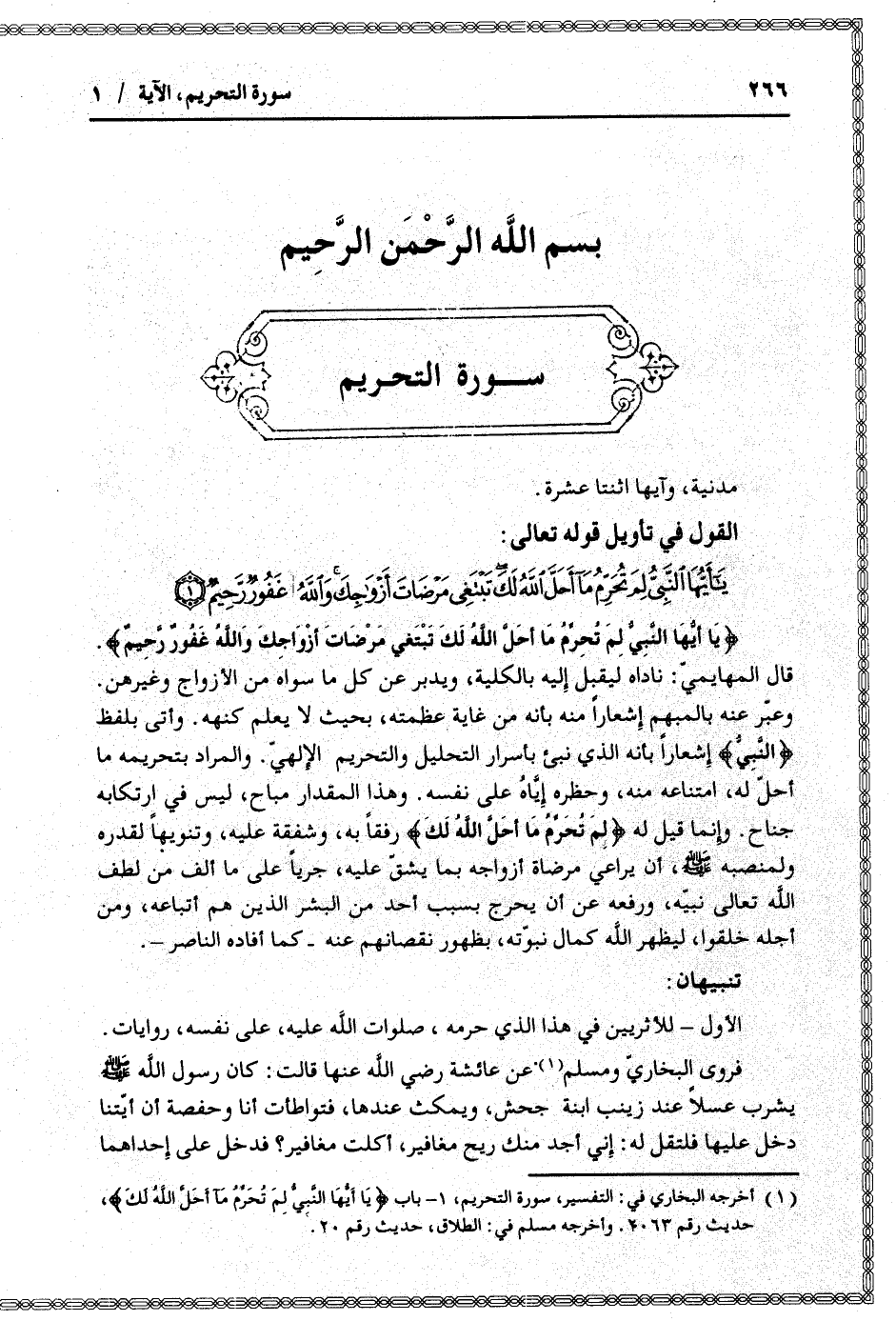 يا أَيُّهَا النَّبِيُّ لِمَ تُحَرِّمُ ما أَحَلَّ اللَّهُ لَكَ تَبْتَغِي مَرْضاتَ أَزْواجِكَ وَاللَّهُ غَفُورٌ رَحِيمٌ (1)