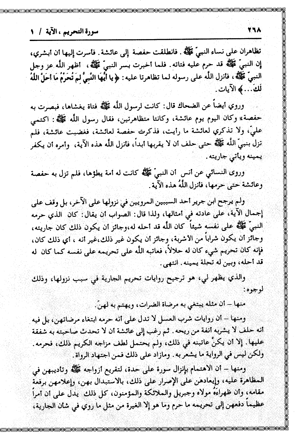 ولم يرجح ابن جرير أحد السببين المرويين في نزولها على الآخر، بل وقف على إجمال الآية، على عادته في أمثالها، ولذا قال: الصواب أن يقال: كان الذي حرمه النبيّ صلى الله عليه وسلم على نفسه شيئا كان الله قد أحله له، وجائز أن يكون ذلك كان جاريته، وجائز أن يكون شرابا من الأشربة، وجائز أن يكون غير ذلك، غير أنه، أي ذلك كان، فإنه كان تحريم شيء كان له حلالا، فعاتبه الله على تحريمه على نفسه كما كان له قد أحله، وبين له تحلة يمينه. انتهى.