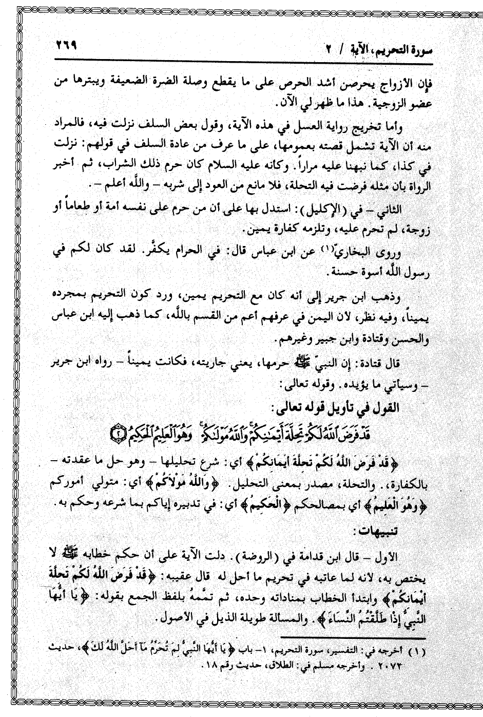 (1) أخرجه في: التفسير، سورة التحريم، 1- باب يا أَيُّهَا النَّبِيُّ لِمَ تُحَرِّمُ ما أَحَلَّ اللَّهُ لَكَ، حديث 2072. وأخرجه مسلم في: الطلاق، حديث رقم 18.