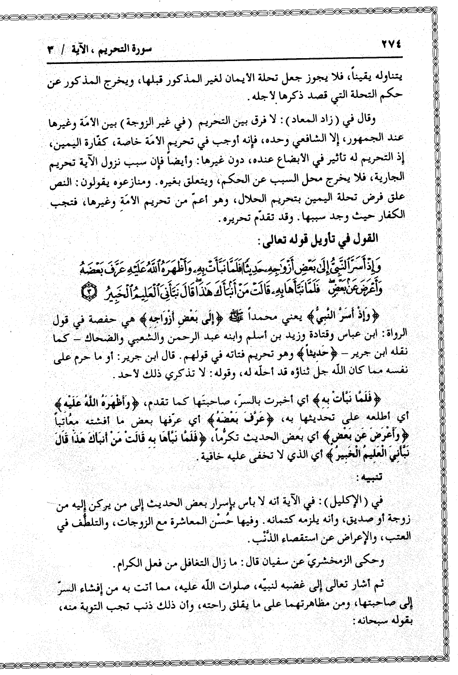 وَإِذْ أَسَرَّ النَّبِيُّ إِلى بَعْضِ أَزْواجِهِ حَدِيثاً فَلَمَّا نَبَّأَتْ بِهِ وَأَظْهَرَهُ اللَّهُ عَلَيْهِ عَرَّفَ بَعْضَهُ وَأَعْرَضَ عَنْ بَعْضٍ فَلَمَّا نَبَّأَها بِهِ قالَتْ مَنْ أَنْبَأَكَ هذا قالَ نَبَّأَنِيَ الْعَلِيمُ الْخَبِيرُ (3)
