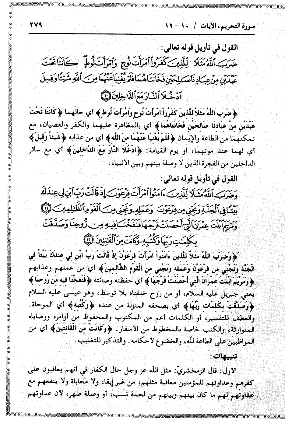 وَضَرَبَ اللَّهُ مَثَلاً لِلَّذِينَ آمَنُوا امْرَأَتَ فِرْعَوْنَ إِذْ قالَتْ رَبِّ ابْنِ لِي عِنْدَكَ بَيْتاً فِي الْجَنَّةِ وَنَجِّنِي مِنْ فِرْعَوْنَ وَعَمَلِهِ وَنَجِّنِي مِنَ الْقَوْمِ الظَّالِمِينَ (11) وَمَرْيَمَ ابْنَتَ عِمْرانَ الَّتِي أَحْصَنَتْ فَرْجَها فَنَفَخْنا فِيهِ مِنْ رُوحِنا وَصَدَّقَتْ بِكَلِماتِ رَبِّها وَكُتُبِهِ وَكانَتْ مِنَ الْقانِتِينَ (12)