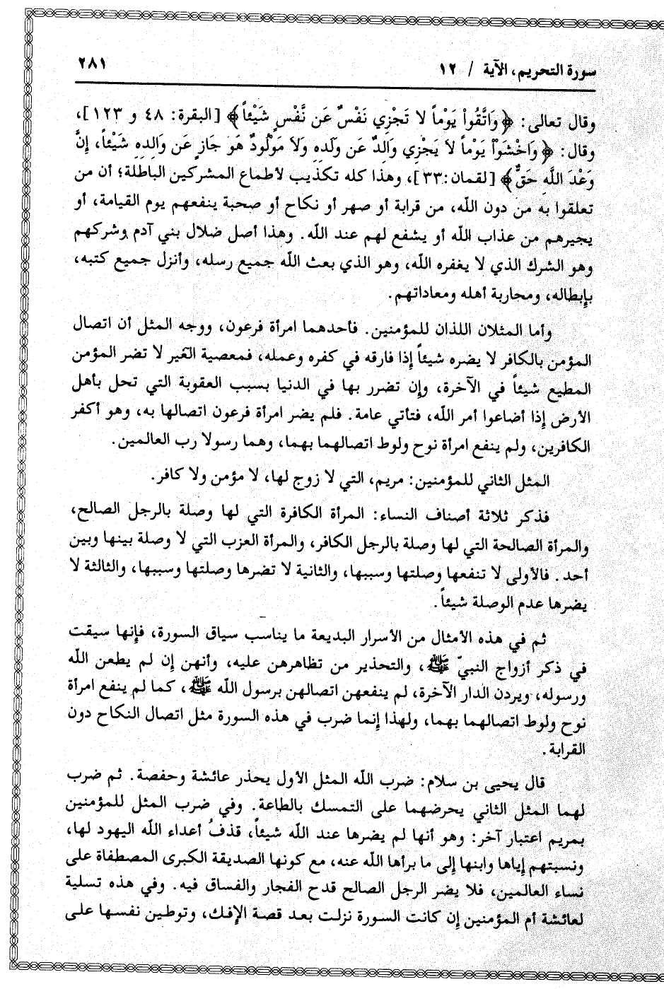 قال يحيى بن سلام: ضرب الله المثل الأول يحذر عائشة وحفصة. ثم ضرب لهما المثل الثاني يحرضهما على التمسك بالطاعة. وفي ضرب المثل للمؤمنين بمريم اعتبار آخر: وهو أنها لم يضرها عند الله شيئا، قذف أعداء الله اليهود لها، ونسبتهم إياها وابنها إلى ما برأها الله عنه، مع كونها الصديقة الكبرى المصطفاة على نساء العالمين، فلا يضر الرجل الصالح قدح الفجار والفساق فيه. وفي هذه تسلية لعائشة أم المؤمنين إن كانت السورة نزلت بعد قصة الإفك، وتوطين نفسها على