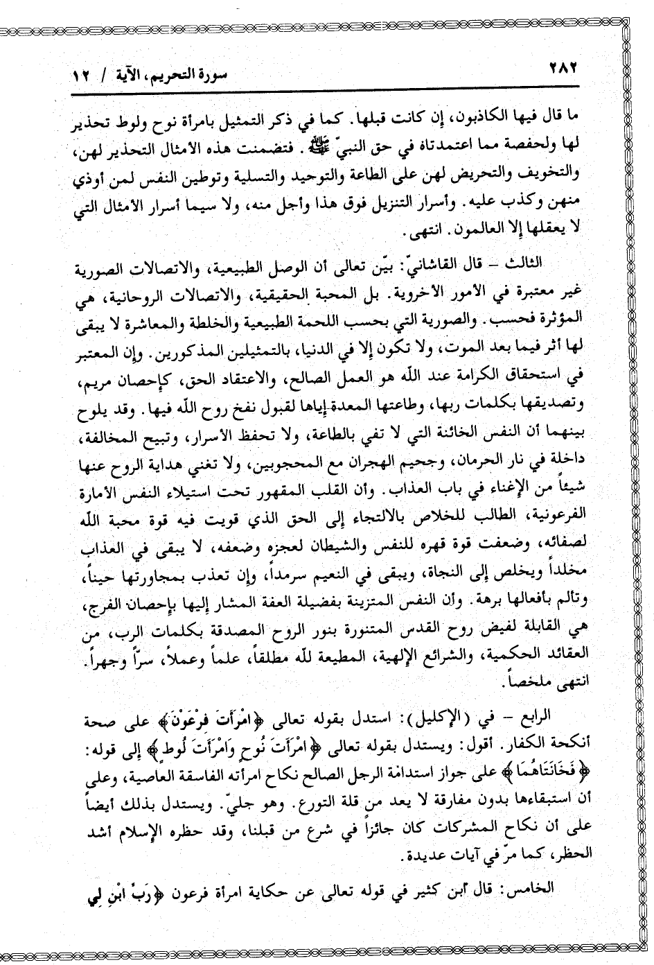 الثالث- قال القاشانيّ: بيّن تعالى أن الوصل الطبيعية، والاتصالات الصورية غير معتبرة في الأمور الأخروية. بل المحبة الحقيقية، والاتصالات الروحانية، هي المؤثرة فحسب. والصورية التي بحسب اللحمة الطبيعية والخلطة والمعاشرة لا يبقى لها أثر فيما بعد الموت، ولا تكون إلا في الدنيا، بالتمثيلين المذكورين. وإن المعتبر في استحقاق الكرامة عند الله هو العمل الصالح، والاعتقاد الحق، كإحصان مريم، وتصديقها بكلمات ربها، وطاعتها المعدة إياها لقبول نفخ روح الله فيها. وقد يلوح بينهما أن النفس الخائنة التي لا تفي بالطاعة، ولا تحفظ الأسرار، وتبيح المخالفة، داخلة في نار الحرمان، وجحيم الهجران مع المحجوبين، ولا تغني هداية الروح عنها شيئا من الإغناء في باب العذاب. وأن القلب المقهور تحت استيلاء النفس الأمارة الفرعونية، الطالب للخلاص بالالتجاء إلى الحق الذي قويت فيه قوة محبة الله لصفائه، وضعفت قوة قهره للنفس والشيطان لعجزه وضعفه، لا يبقى في العذاب مخلدا ويخلص إلى النجاة، ويبقى في النعيم سرمدا، وإن تعذب بمجاورتها حينا، وتألم بأفعالها برهة. وأن النفس المتزينة بفضيلة العفة المشار إليها بإحصان الفرج، هي القابلة لفيض روح القدس المتنورة بنور الروح المصدقة بكلمات الرب، من العقائد الحكمية، والشرائع الإلهية، المطيعة لله مطلقا، علما وعملا، سرّا وجهرا.