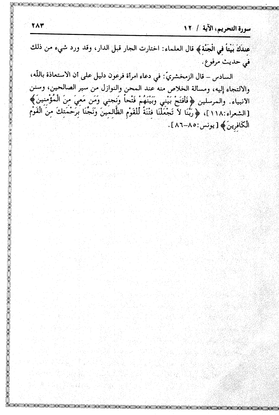 السادس- قال الزمخشريّ: في دعاء امرأة فرعون دليل على أن الاستعاذة بالله، والالتجاء إليه، ومسألة الخلاص منه عند المحن والنوازل من سير الصالحين، وسنن الأنبياء. والمرسلين فَافْتَحْ بَيْنِي وَبَيْنَهُمْ فَتْحاً وَنَجِّنِي وَمَنْ مَعِيَ مِنَ الْمُؤْمِنِينَ [الشعراء: 118] ، رَبَّنا لا تَجْعَلْنا فِتْنَةً لِلْقَوْمِ الظَّالِمِينَ وَنَجِّنا بِرَحْمَتِكَ مِنَ الْقَوْمِ الْكافِرِينَ [يونس: 85- 86] .