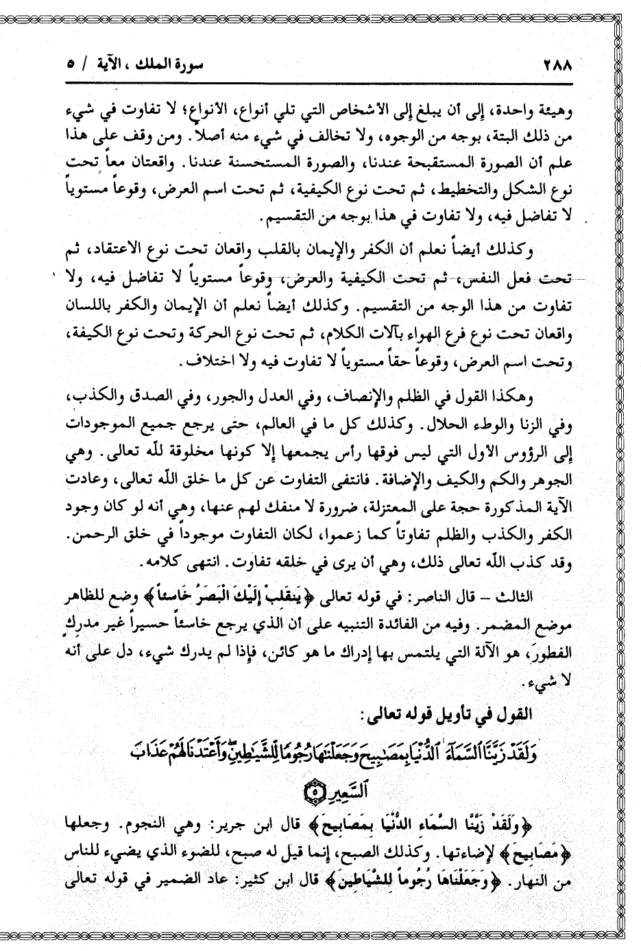 وهكذا القول في الظلم والإنصاف، وفي العدل والجور، وفي الصدق والكذب، وفي الزنا والوطء الحلال. وكذلك كل ما في العالم، حتى يرجع جميع الموجودات إلى الرؤوس الأول التي ليس فوقها رأس يجمعها إلا كونها مخلوقة لله تعالى. وهي الجوهر والكم والكيف والإضافة. فانتفى التفاوت عن كل ما خلق الله تعالى، وعادت الآية المذكورة حجة على المعتزلة، ضرورة لا منفك لهم عنها، وهي أنه لو كان وجود الكفر والكذب والظلم تفاوتا كما زعموا، لكان التفاوت موجودا في خلق الرحمن.