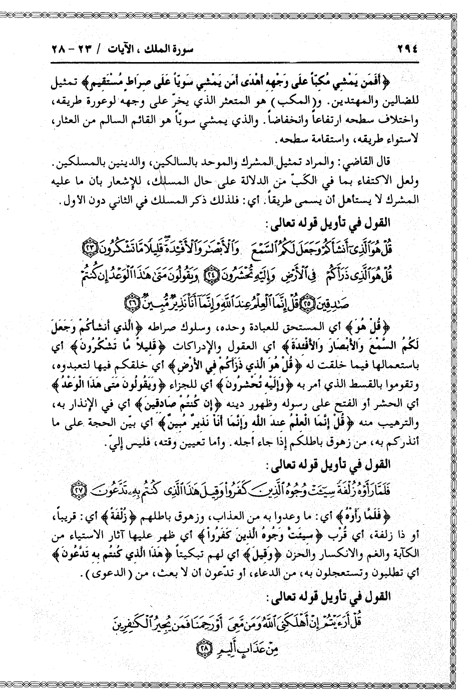 قُلْ هُوَ الَّذِي أَنْشَأَكُمْ وَجَعَلَ لَكُمُ السَّمْعَ وَالْأَبْصارَ وَالْأَفْئِدَةَ قَلِيلاً ما تَشْكُرُونَ (23) قُلْ هُوَ الَّذِي ذَرَأَكُمْ فِي الْأَرْضِ وَإِلَيْهِ تُحْشَرُونَ (24) وَيَقُولُونَ مَتى هذَا الْوَعْدُ إِنْ كُنْتُمْ صادِقِينَ (25) قُلْ إِنَّمَا الْعِلْمُ عِنْدَ اللَّهِ وَإِنَّما أَنَا نَذِيرٌ مُبِينٌ (26)
