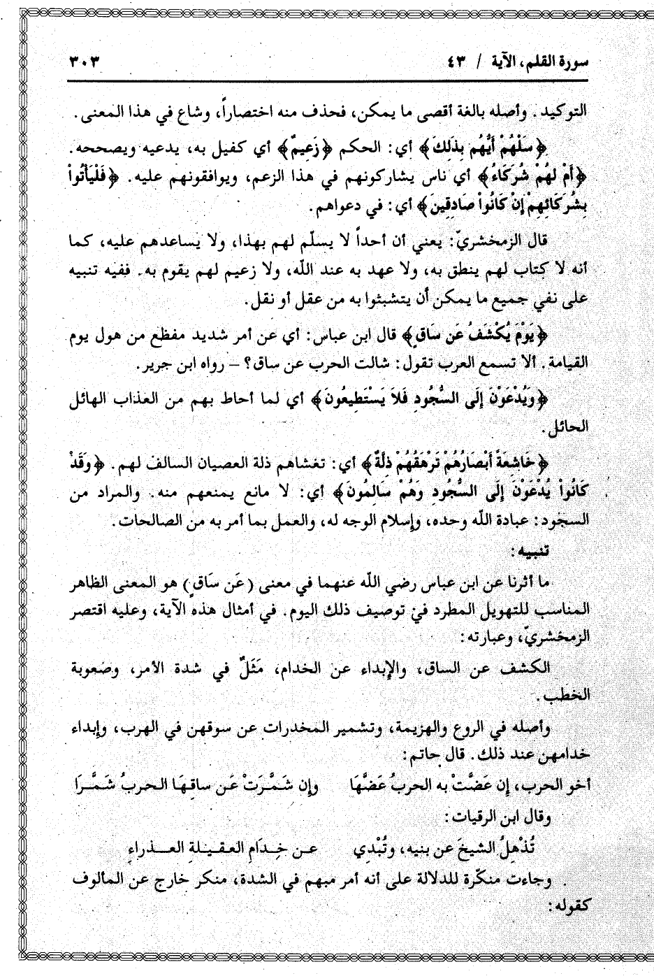 يَوْمَ يُكْشَفُ عَنْ ساقٍ قال ابن عباس: أي عن أمر شديد مفظع من هول يوم القيامة. ألا تسمع العرب تقول: شالت الحرب عن ساق؟ - رواه ابن جرير.