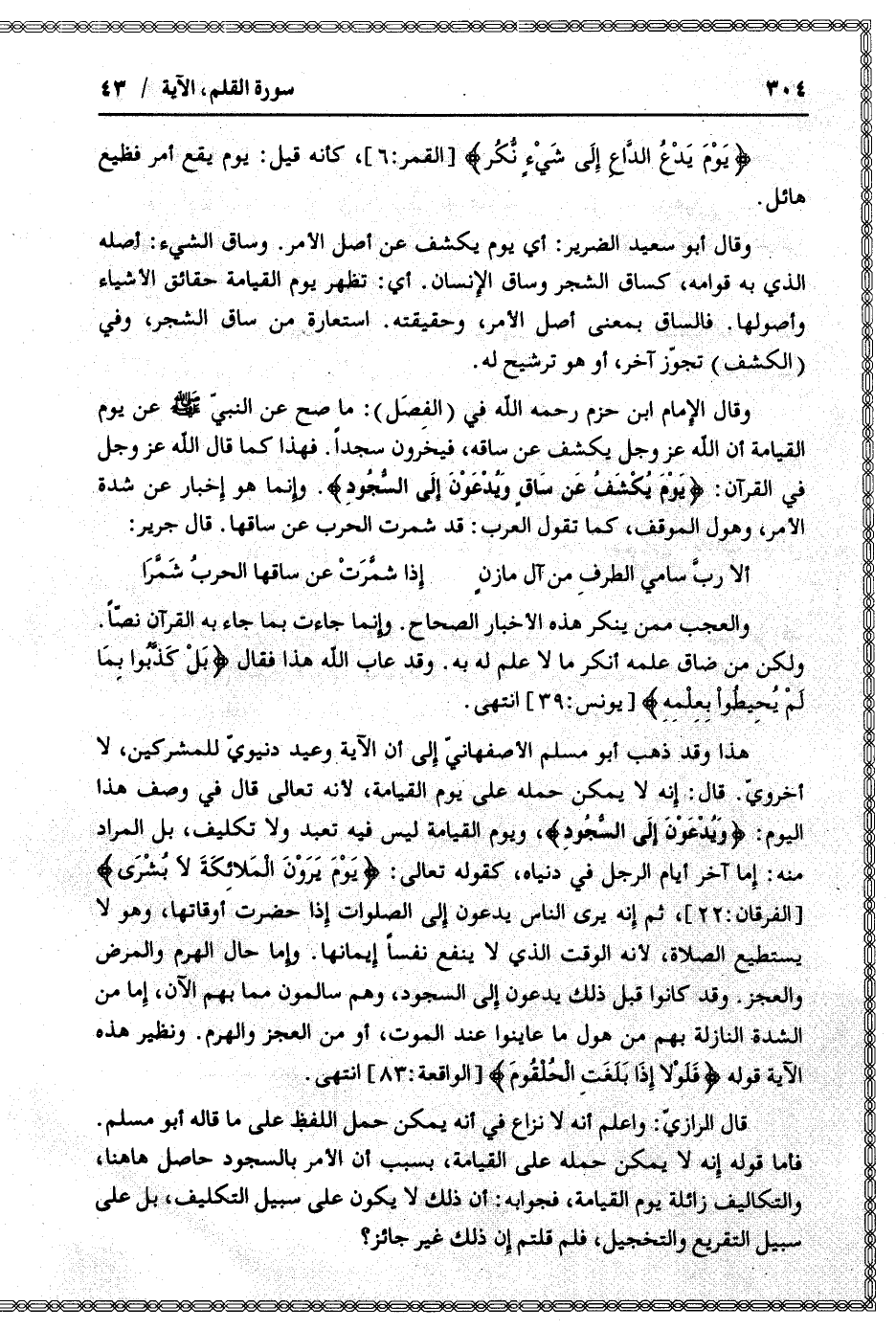 وقال الإمام ابن حزم رحمه الله في (الفصل) : ما صح عن النبيّ صلّى الله عليه وسلم عن يوم القيامة أن الله عز وجل يكشف عن ساقه، فيخرون سجدا. فهذا كما قال الله عز وجل في القرآن: يَوْمَ يُكْشَفُ عَنْ ساقٍ وَيُدْعَوْنَ إِلَى السُّجُودِ. وإنما هو إخبار عن شدة الأمر، وهول الموقف، كما تقول العرب: قد شمرت الحرب عن ساقها. قال جرير: