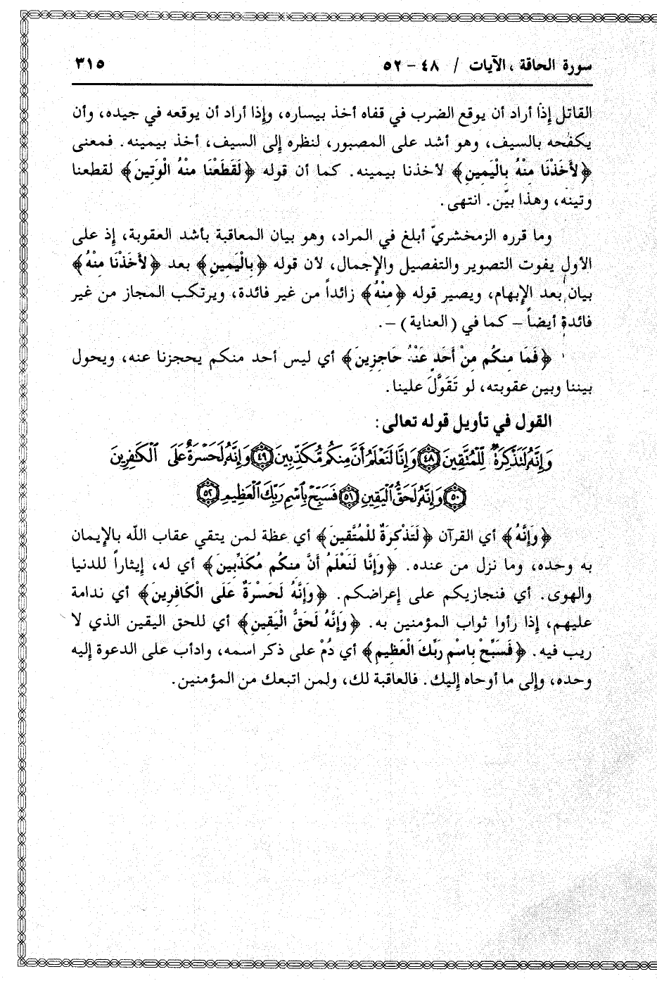 وَإِنَّهُ لَتَذْكِرَةٌ لِلْمُتَّقِينَ (48) وَإِنَّا لَنَعْلَمُ أَنَّ مِنْكُمْ مُكَذِّبِينَ (49) وَإِنَّهُ لَحَسْرَةٌ عَلَى الْكافِرِينَ (50) وَإِنَّهُ لَحَقُّ الْيَقِينِ (51) فَسَبِّحْ بِاسْمِ رَبِّكَ الْعَظِيمِ (52)